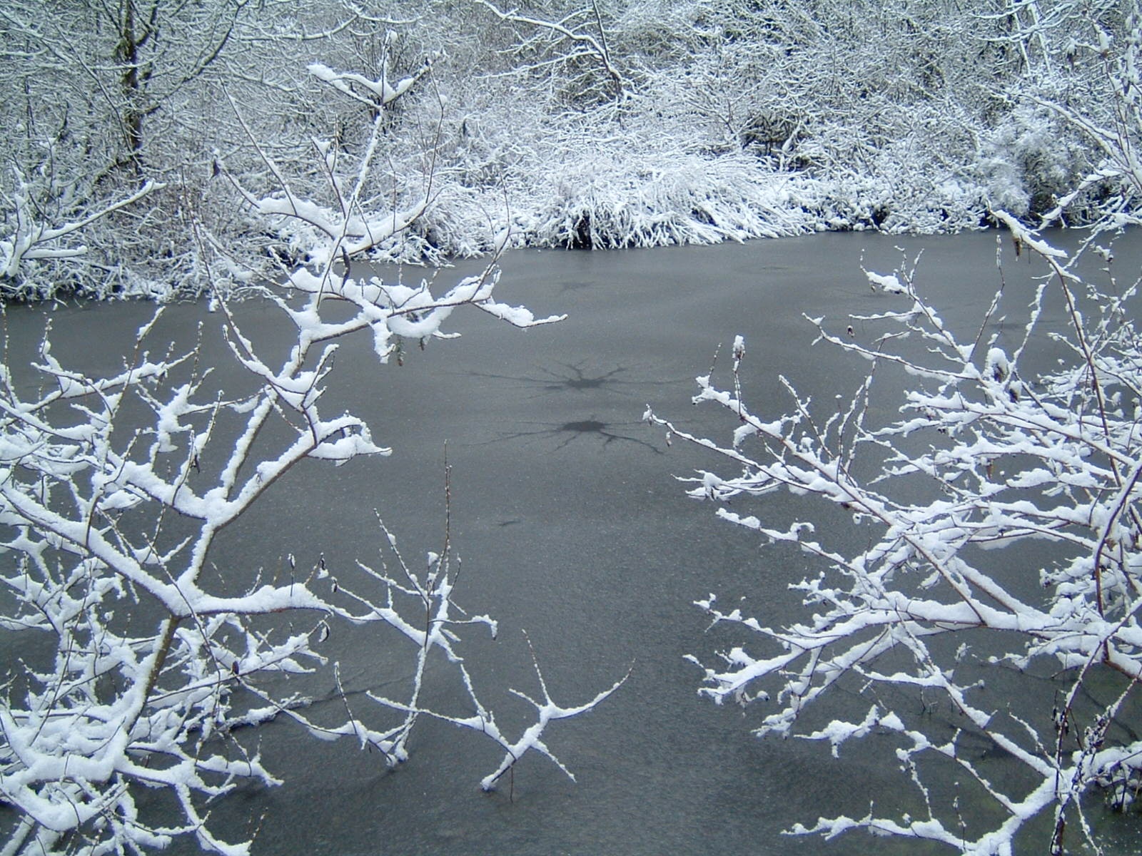 frozen pond + snow. what happened in the middle of my pond? looks weird