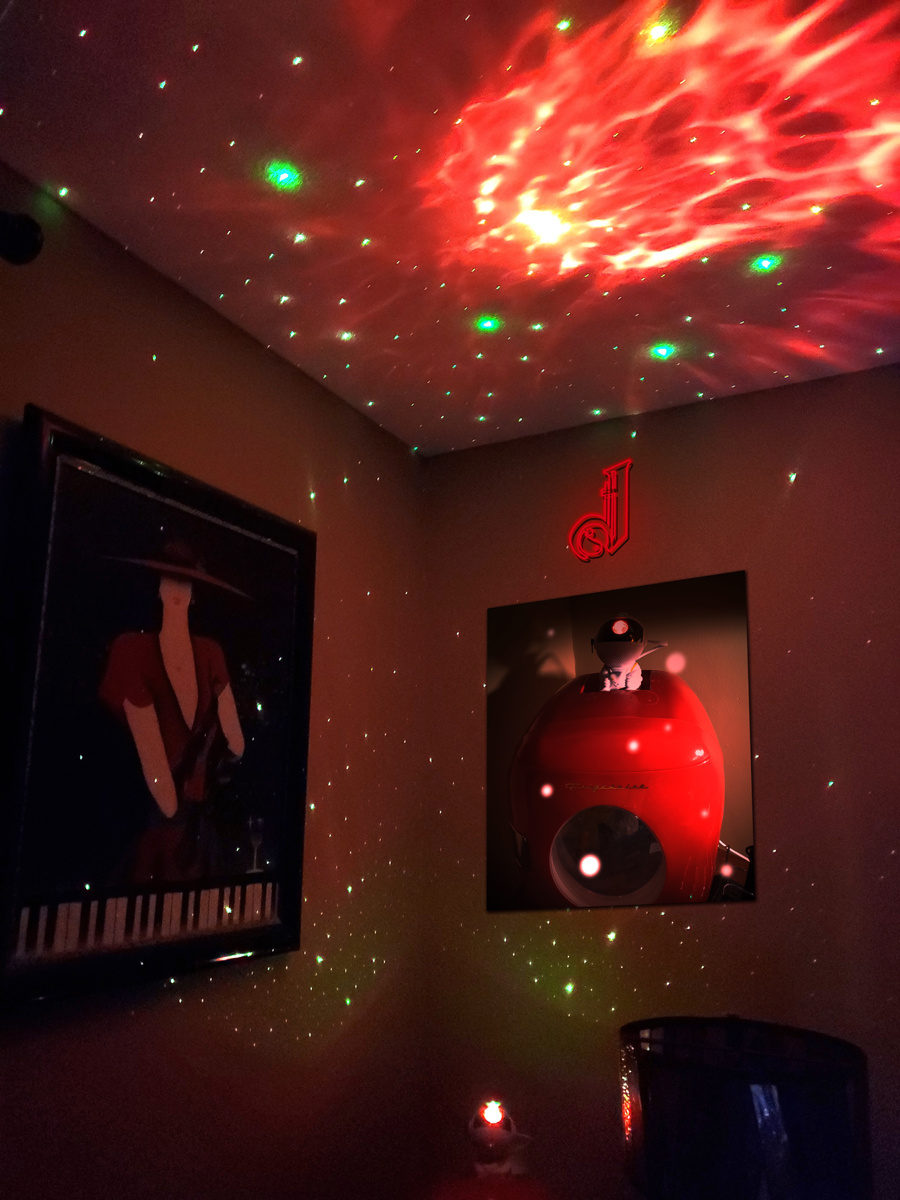 ---As for the concoction above? It's composed of two images and my watermark logo "Big J"...The largest image is the corner of my bedroom with the projector (center below) switched on...The second image is the close-up of the projector itself sitting atop my mini fridge (For my insulin and a few cans of Diet Pepsi) that sits on the nightstand beside my bed...And of course, there is the "Big J" logo, given a "Neon-sign-on-the-wall" motiff that many of you have seen in some of the other creations within my gallery...