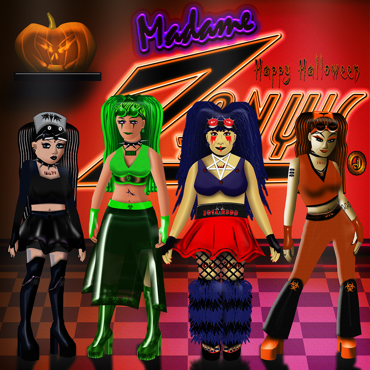 ...Another Halloween-inspired concoction... L to R: SALL3Y3... Shutt... Jo1A R3dd...and T44T1... The background was borrowed and slightly modified from this piece... See Also: SALL3Y3 @ Club Modemm...