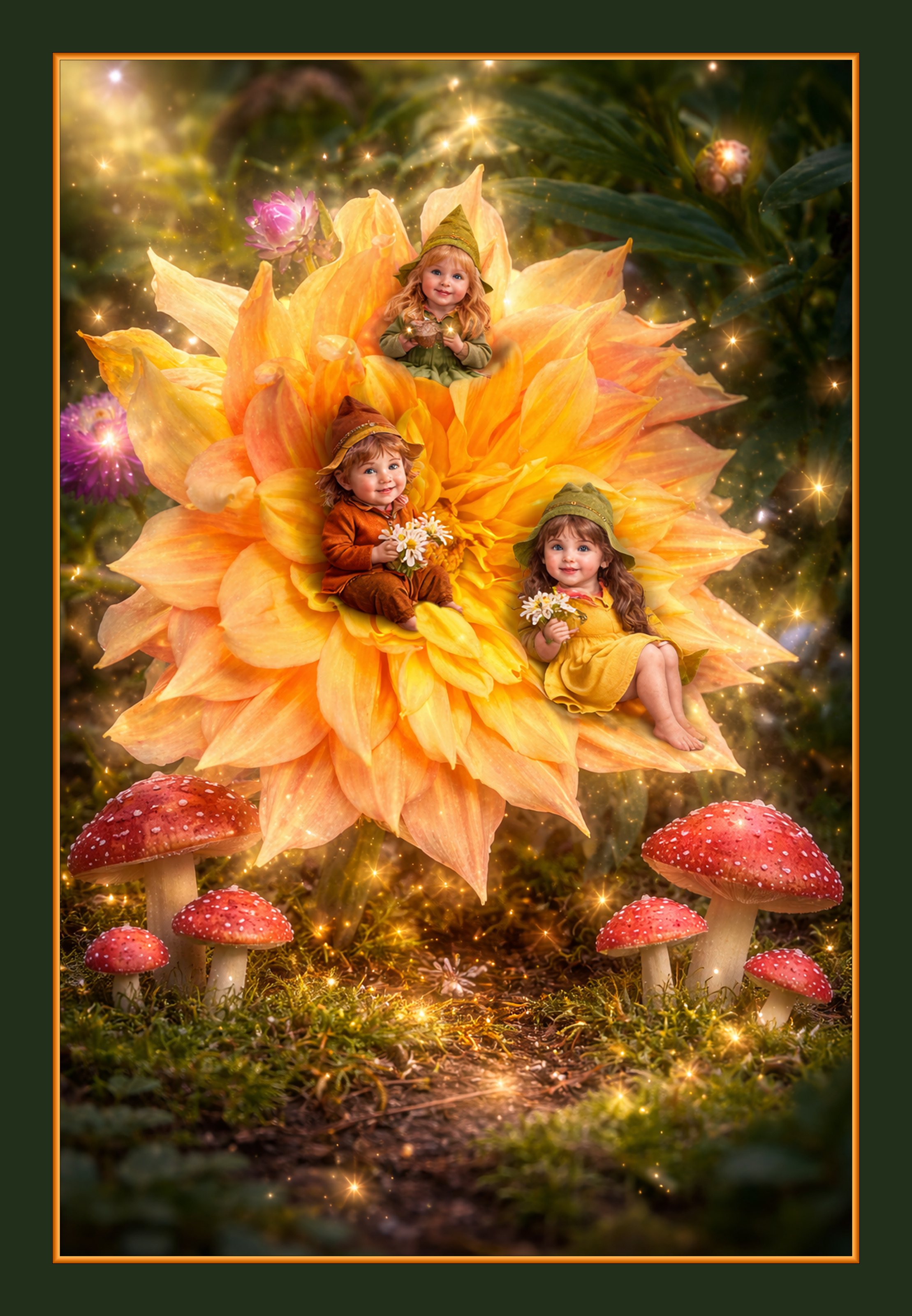 My first try with AI. The photo of the dahlia and straw flowers is my own. The additions curtesy of my various instructions to ChatGPT. I had to manually cover the middle elf's feet as they appeared as pigs trotters ! Lol.
