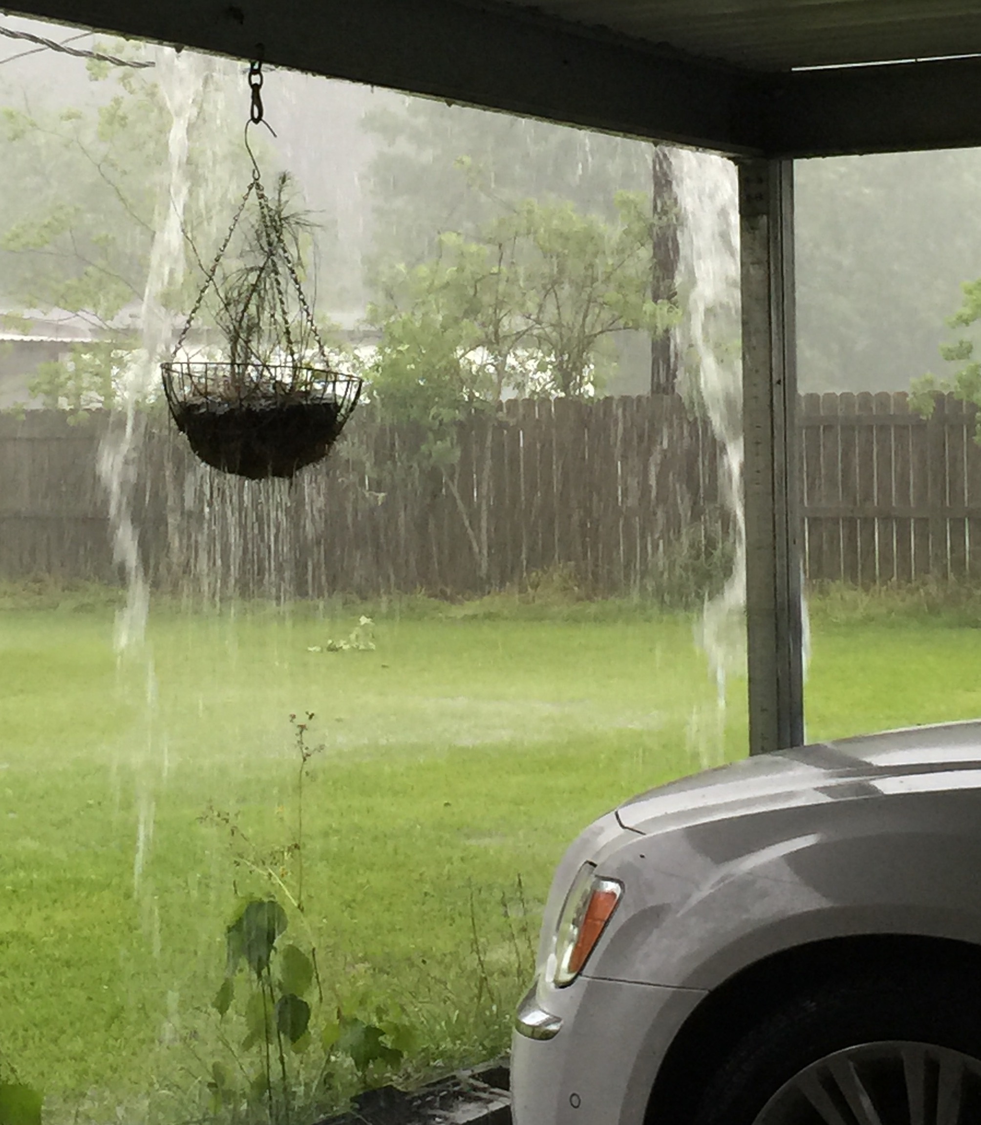 I know this is not a picture you would want to use for the old desktop but just thought I would show you how it rains around my neck of the woods. This is looking out from under my carport towards the back yard. You can see the yard filling up with water. But the land here can handle water. We can get 3 inches of rain and never flood. One time we got 10 inches in two days and never had a problem. I have to laugh when people up North get all excited over and inch or two of rain. That's nothing here. I'll post a couple more in the few days.