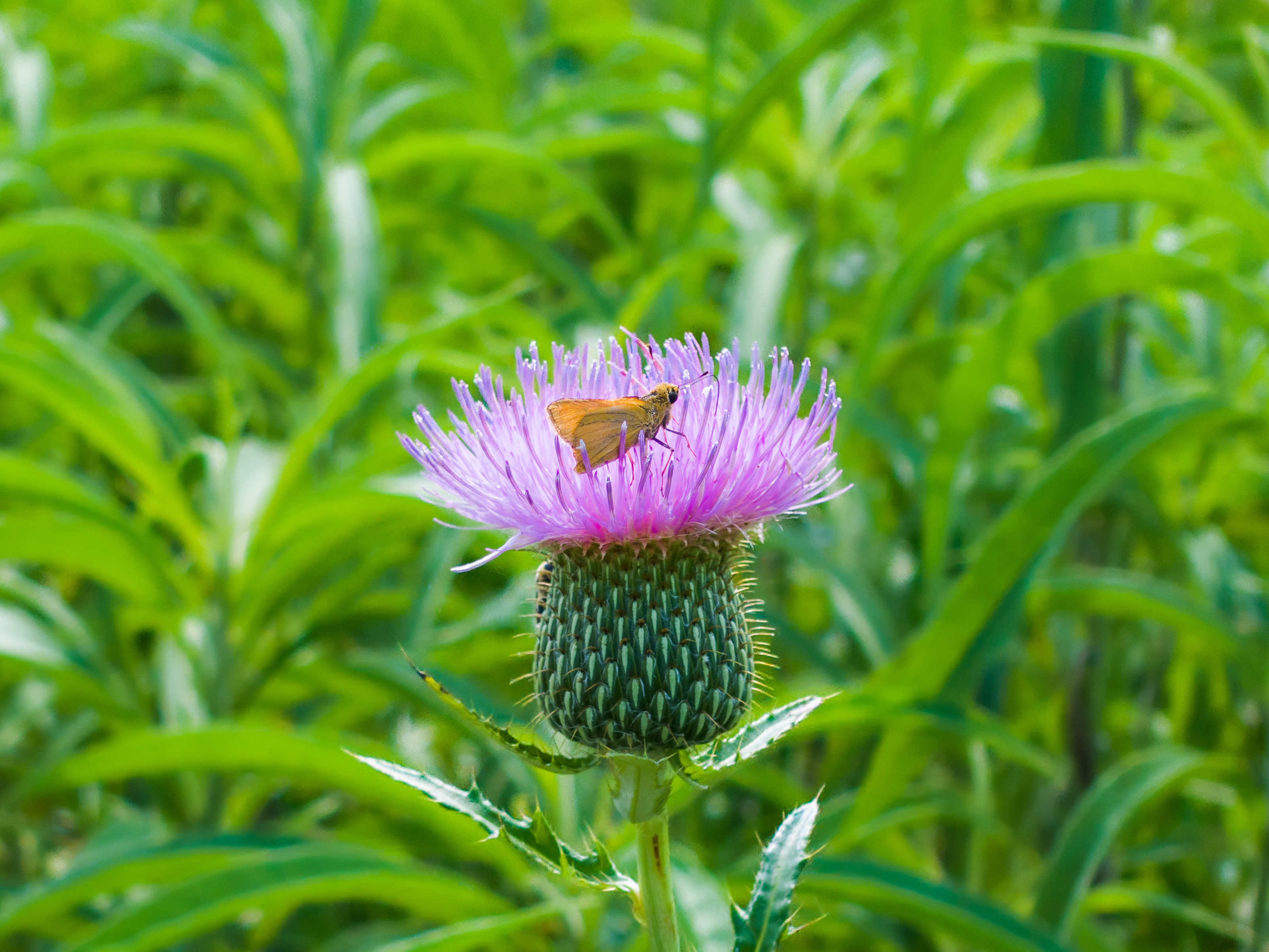 Small moth of some sort on a thistle. For a weed, I really like the complex patterns that a thistle bloom displays.