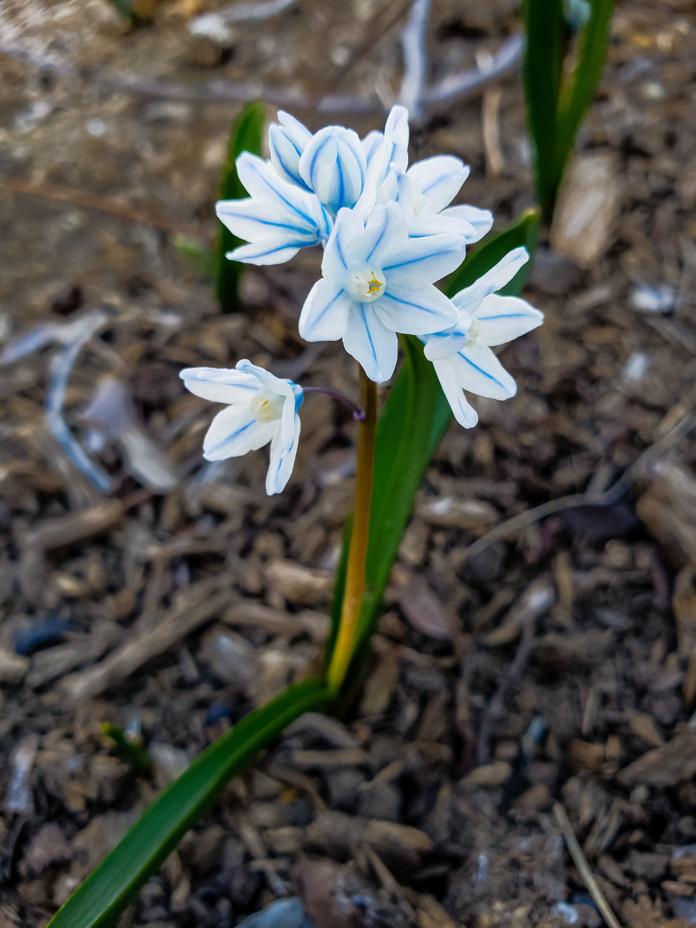 The blades have been up for over a week, but the other day, I looked at the garden in the morning and that evening I found this pretty, tiny set of blossoms. Spring has sprung.