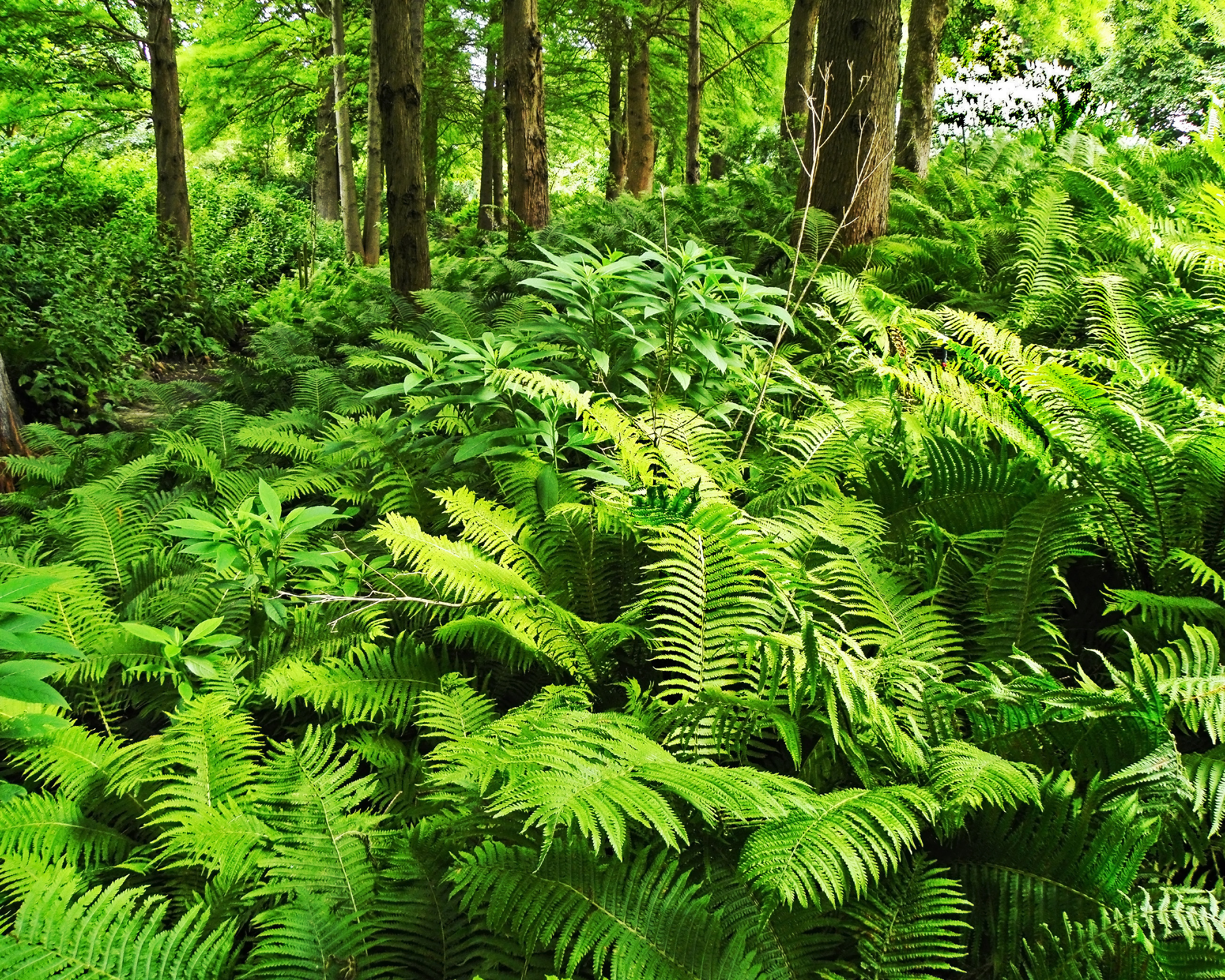 Lush green ferns and other plants around the trees. Photo taken about two weeks ago.