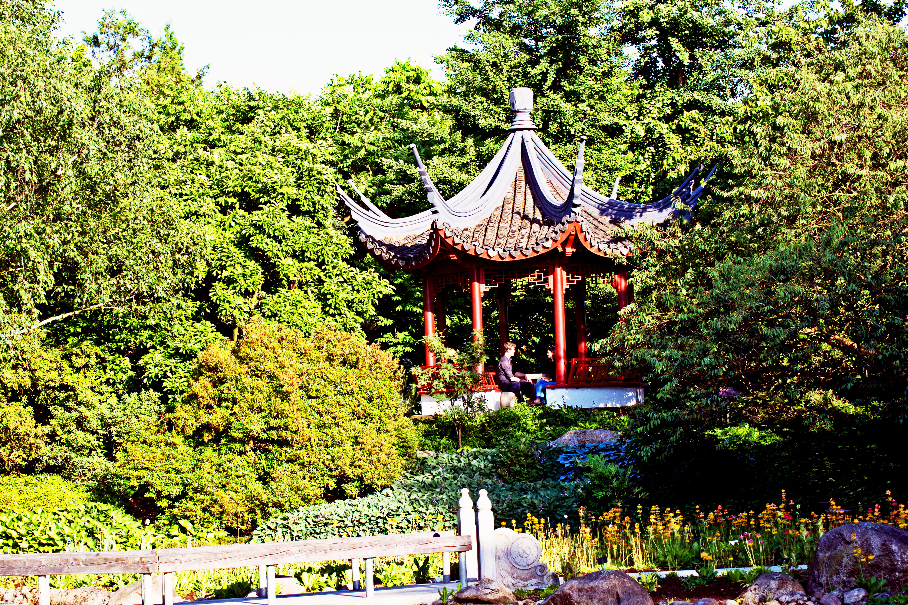 This Chinese style pagoda is a nice place to take a break if you are tired of walking in the park. Here this young pair is making use of it.