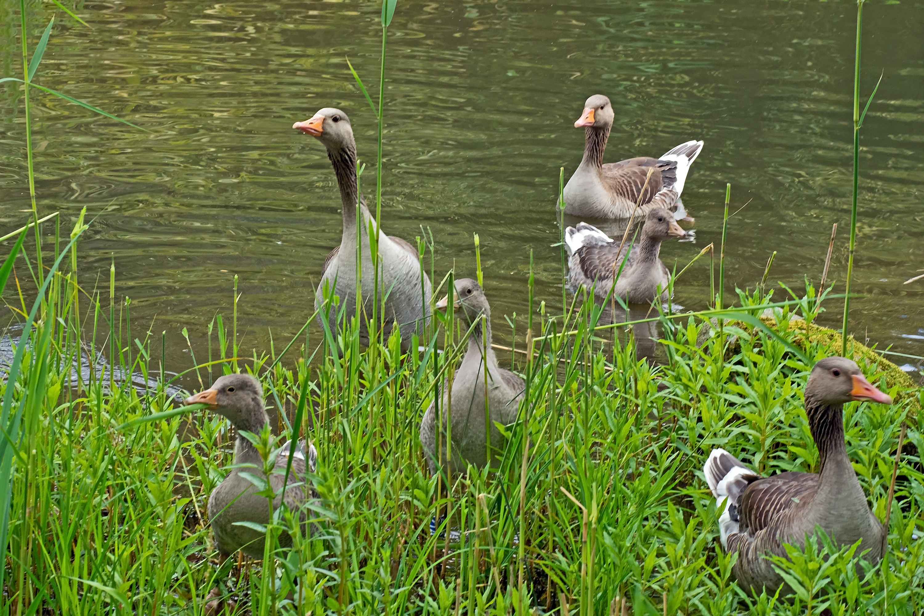 A family of greylag geese all listening for any noise that may mean danger (Birds of prey).