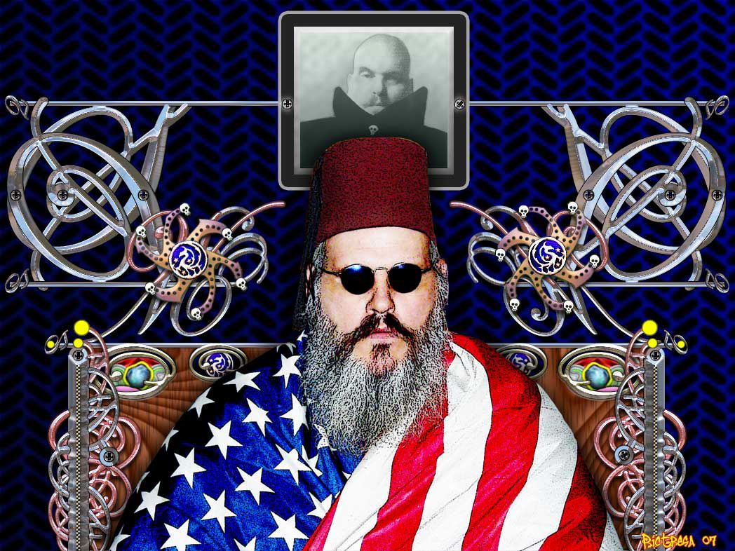 I am my own best hero... Most all of my graphics revolve around me, some way or another. The metal work behind me, (and down the sides of my chair) started life as Edwardian Script. I rasterized it and then had my way with it. Chrome was rendered with, Eye Candy 4000. The graphic was created using PS Version 7 and the original photo taken with my Olympus Stylus 300, tripod and remote shutter used.