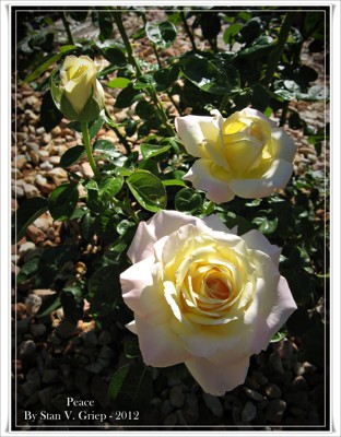 Peace is a special rose whose history dates back to WWII when she nearly did not come to be. That history alone is enough for me to want her in my rosebeds. Not to mention her pretty color tones and wonderful fragrance. Hope you enjoy this shot of her pretty bloom smiles.