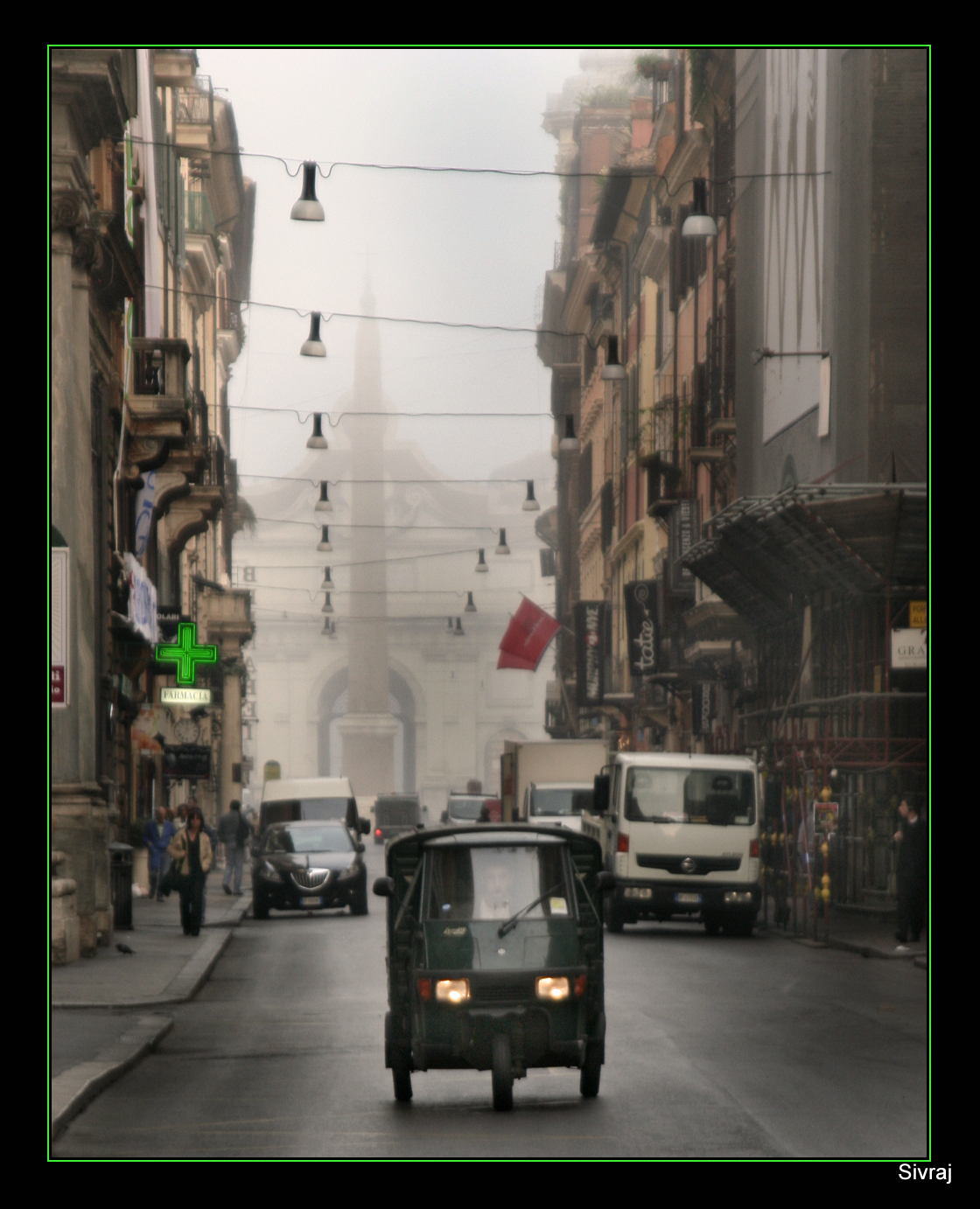 In Rome, a view along the Via del Corso towards the Piazza del Popolo in the misty background with one of the many strange little vehicles the Italian city dwellers love to drive.