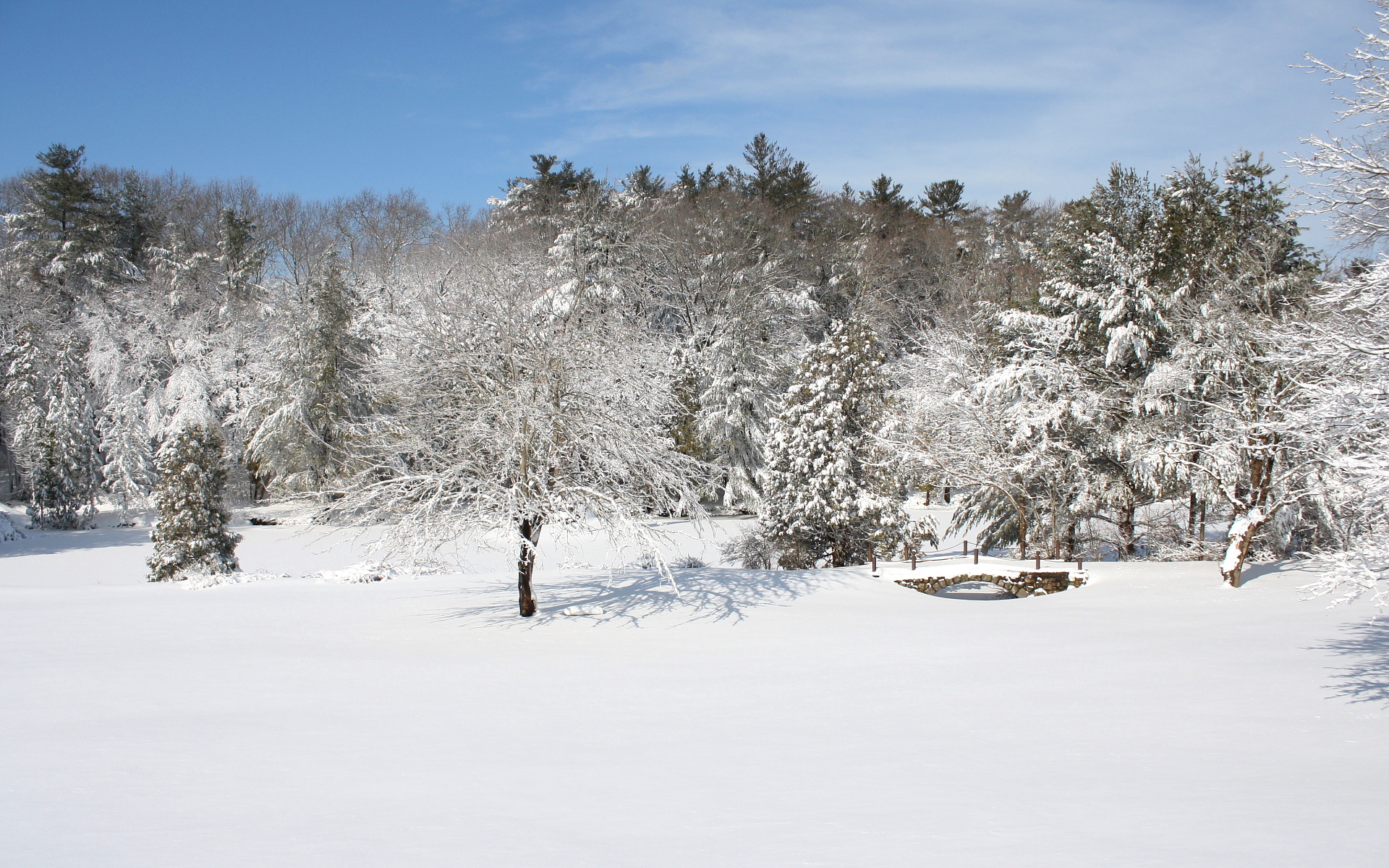 About a foot of new snow covers this park like area.