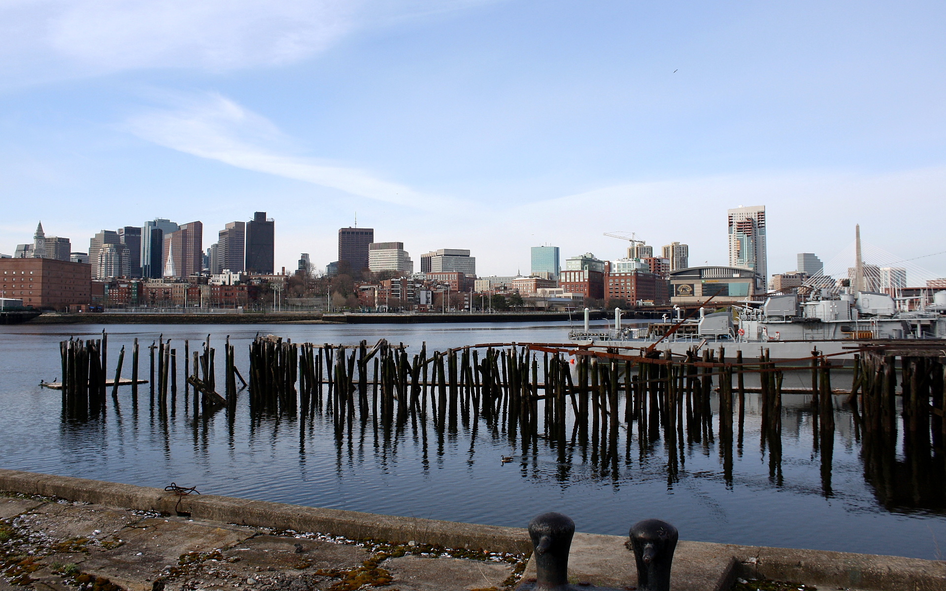Another view of Boston from the Charlestown docks. Much of the view on the left side is called the financial district and to the right is the Boston garden sports arena just over the ship.
