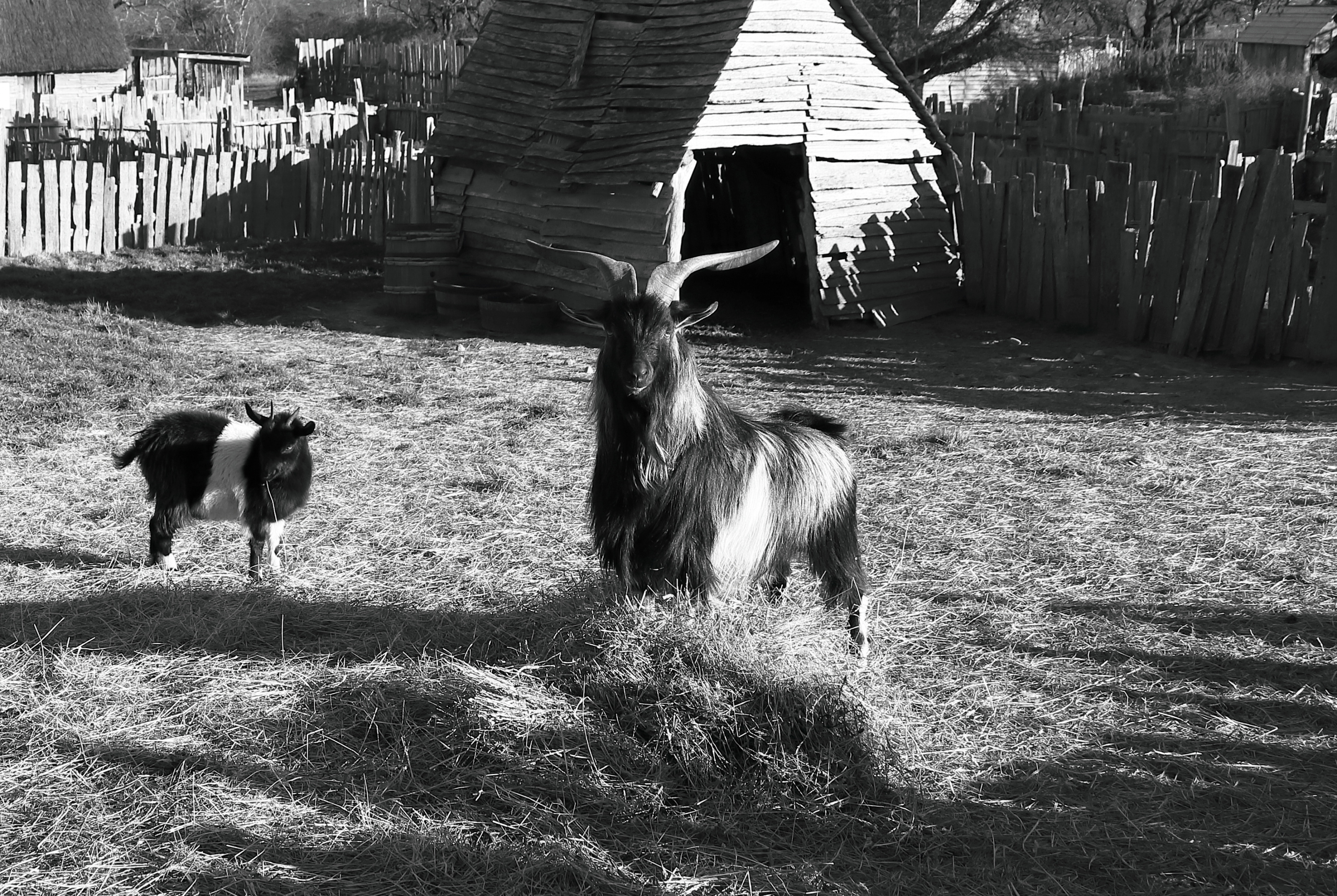 This is a Dutch Landrace Goat taken at Plymouth Plantation. Also call ed Nederlandse Landgeit, it has been in the Netherlands since the 17th century. It was brought back from the brink of extinction in the 1950s. The pilgrims sailed from there to Plymouth and brought them with them most likely. This was a color photo made into B+W.