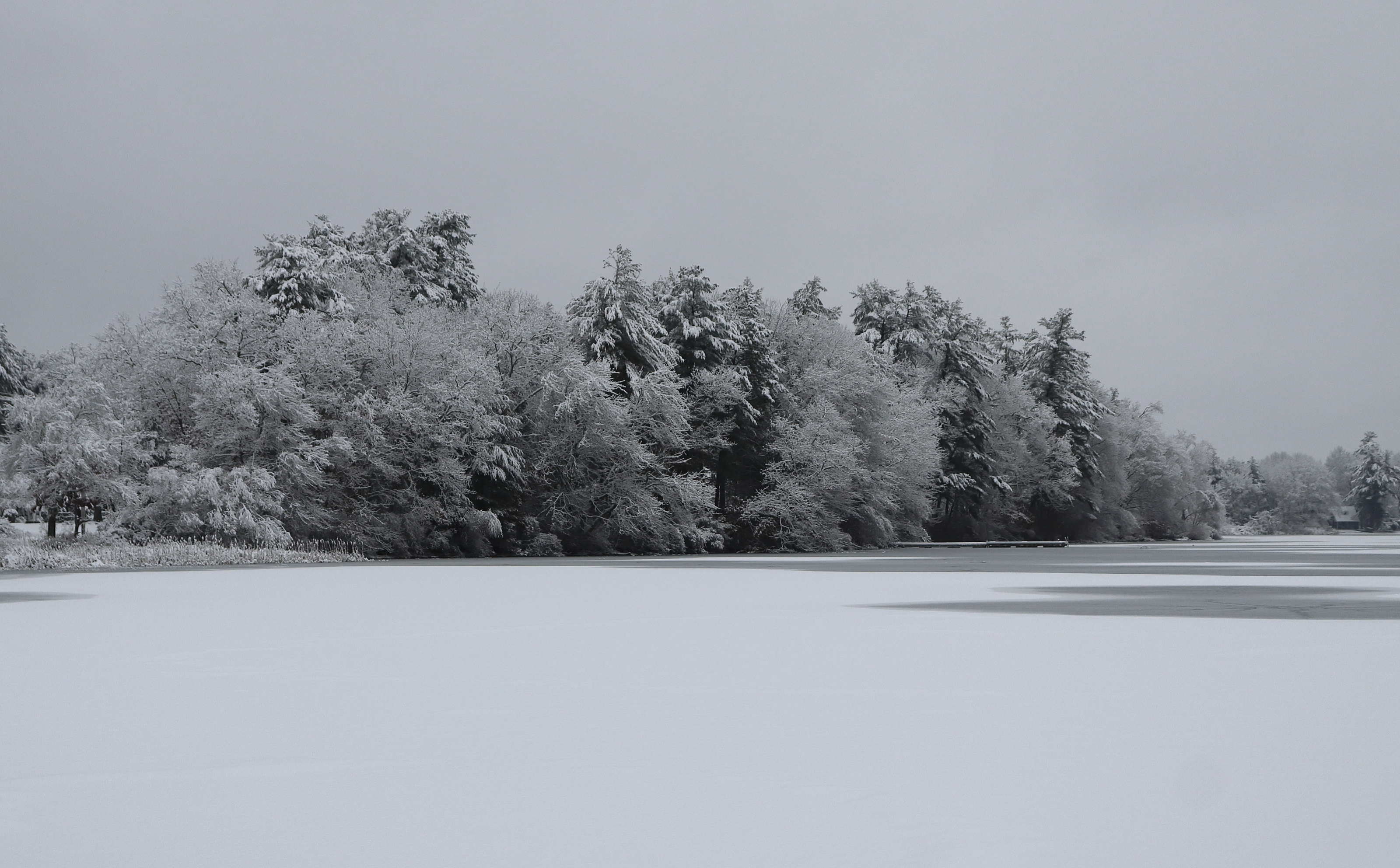 Freshly fallen snow on this pond turns the ice white before it melts and changes.