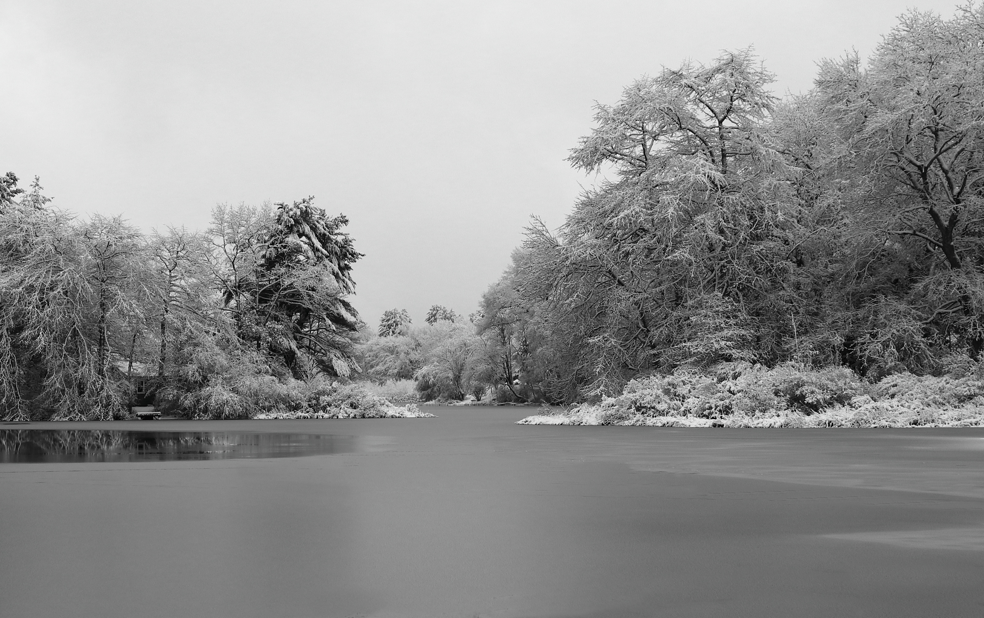 There is a small cottage in the woods showing its window. I removed the color from this photo because of the strange tint in the ice that is common right after it snows and not yet fully frozen.