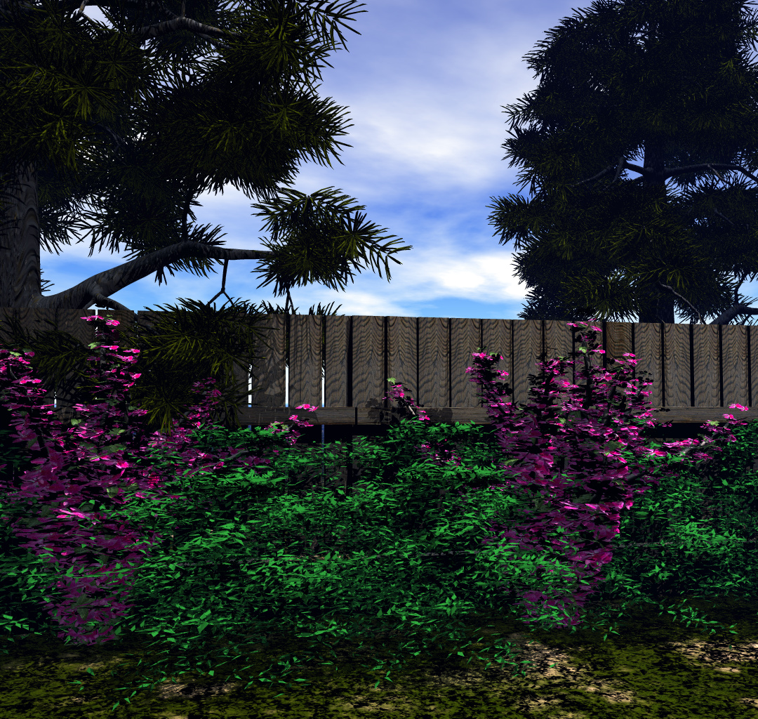 Bryce 7 Pro for render and models. Xara Xtreme for Vector Image, aka fence. Paint Shop Pro for mesh images. Playing with wood. Wood seems to be quite easy. I got lazy and simply duplicated the wooden slats. I did not make the base model Independent. Once I realized my mistake I had already invested several hours on the base fence so I just ran with it. Something else I noticed, last couple images I rendered at 1080 x 1024. That resolution shows more bottom than the render I typically use 3199 x 2400. I will have to pay more attention to lower ground detail in lower resolutions, lessoned learned.