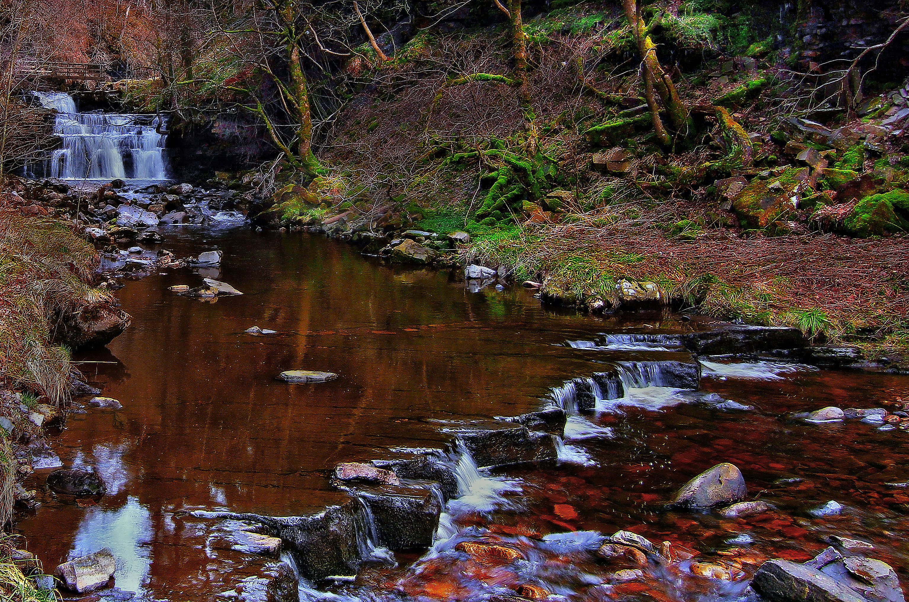 Ashgill Burn begins its life as a small stream known as Little Gill, it finds its source at a height of more than 2,300 feet on the northwestern slopes of Burnhope Seat in the North Pennine Hills. The gill descends into a steep gorge as it reaches the Pennine road from Alston to Middleton-in-Teesdale ( B6277) and below the road bridge the gill falls a spectacular fifty feet from a rock shelf into a pool in the wooded valley below. The force is not visible from the road. It is possible to walk behind the waterfall and remain dry where the sedimentary rocks laid down when the area was covered by the "Midlands Sea" can be seen. Geologists across the world refer to this type of rock formation as the Ashgill Event.