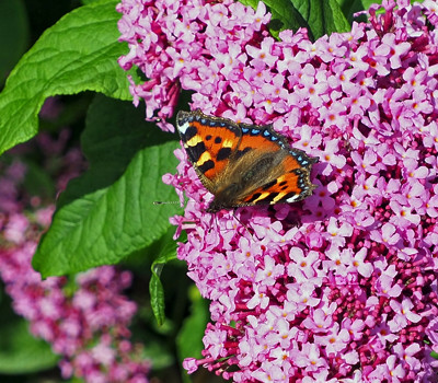 Small Tortoiseshell butterfly on my newly emerged Butterfly bush..R.