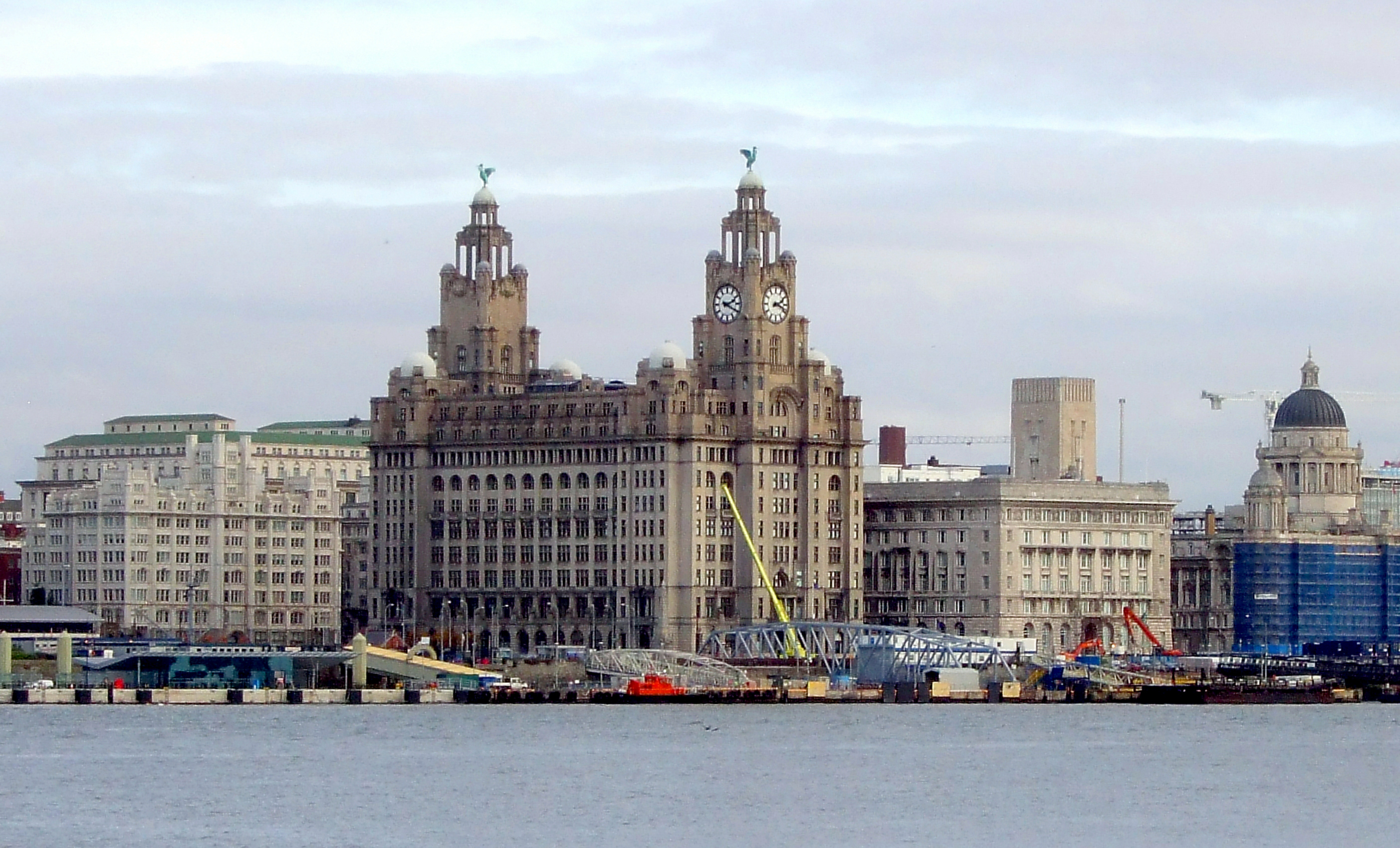 The Pride of The Liverpool Waterfront. The large building with the clocks is The Royal Liver Building. The building to its right is The Cunard Building. The building to its right is The Port Of Liverpool Building. The building with the green roof is India Buildings.