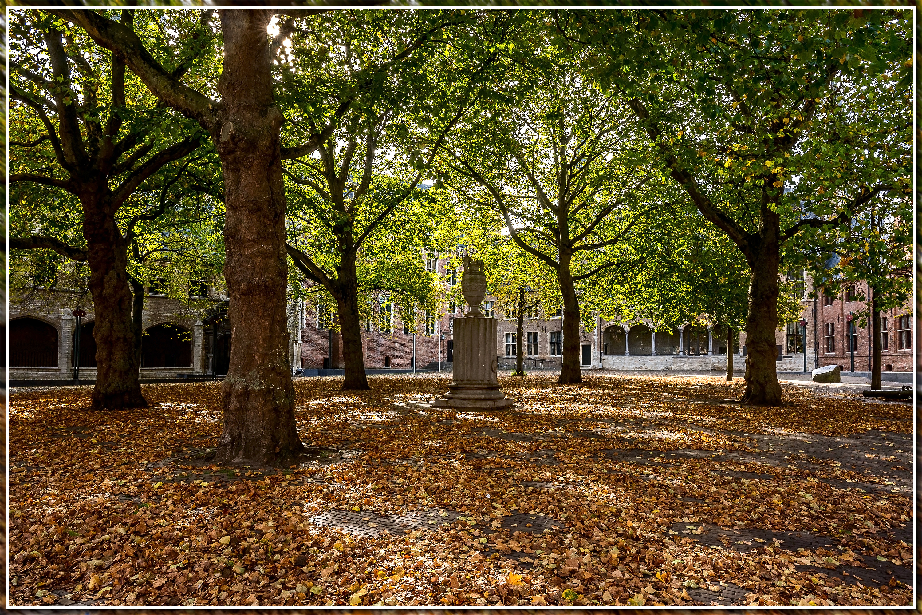 Although the Abbey Square is strewn with autumn leaves, one can see that autumn hasn't yet fully arrived here because of the still green foliage on the trees.