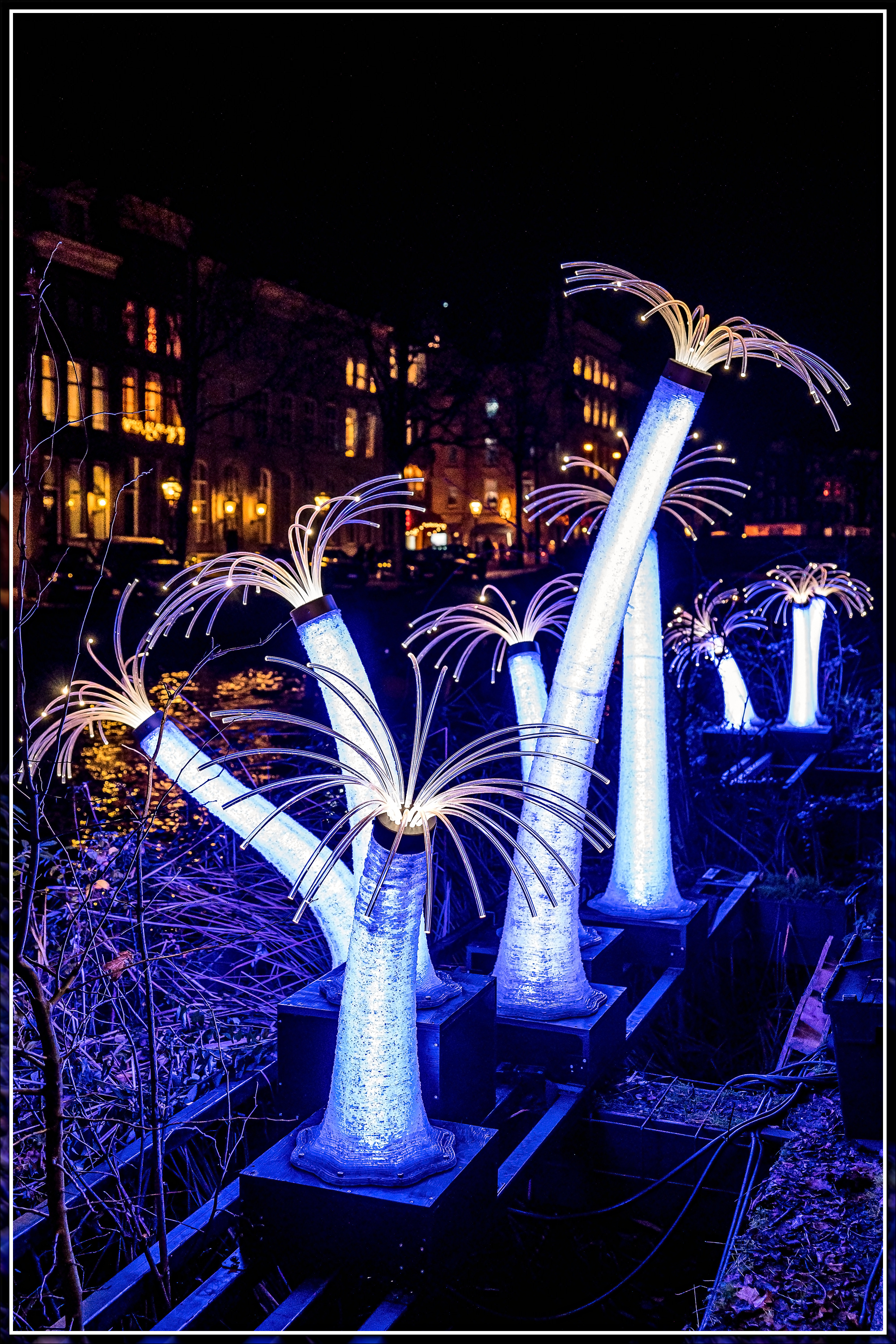 This image shows the artwork 'Coral Lumination'. The artwork was one of about 20-30 unique light installations displayed along the canals of Amsterdam during the 14th edition of the festival, which ran from November 27th, 2025, to January 18th, 2026, featured the theme 'Legacy'.