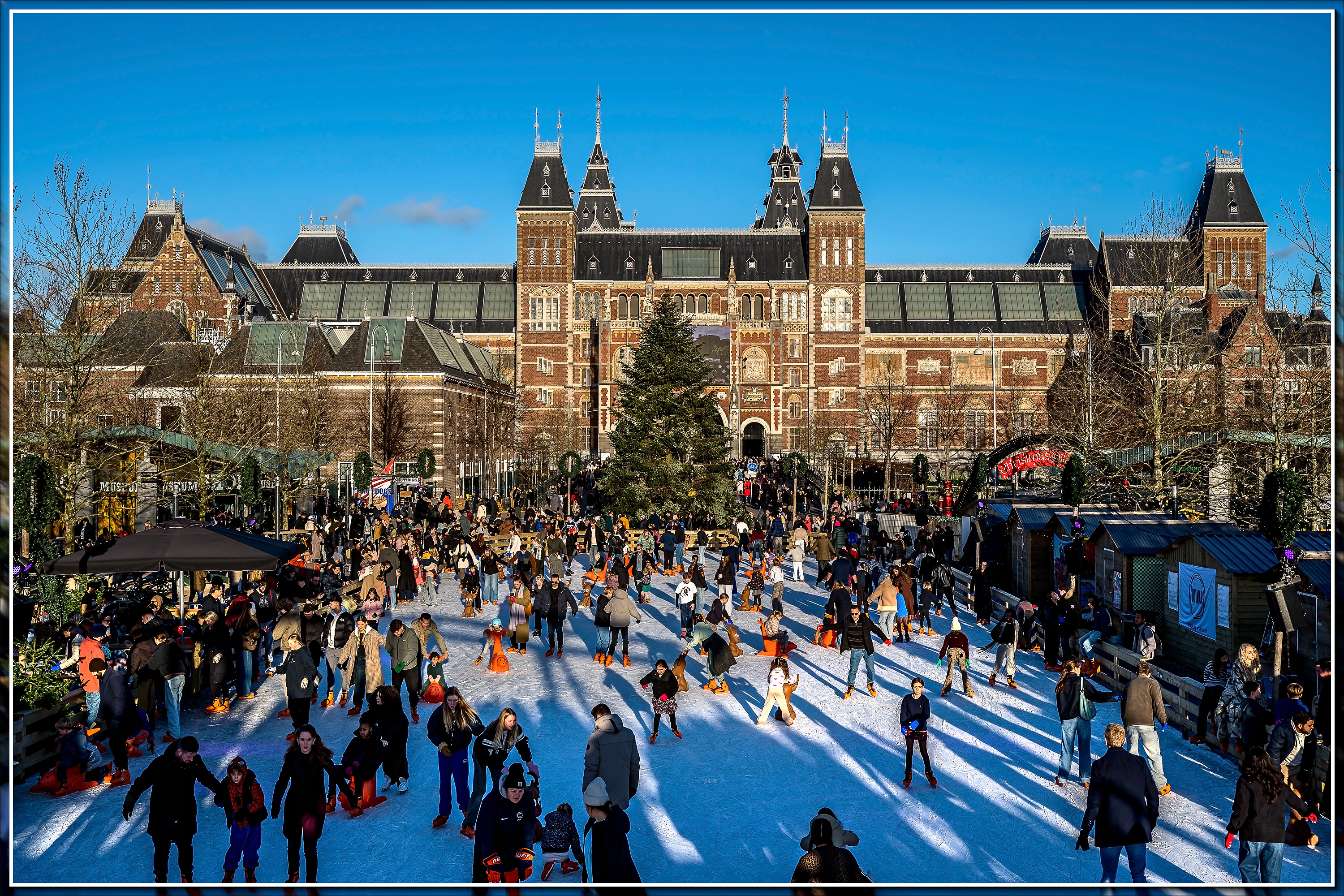 This image shows a winter scene at the 'Museumplein' (Museum Square) in Amsterdam. During the winter holidays the square (situated at the rear side of the Rijksmuseum) is often transformed into an ice skating rink, surrounded by festive decorations.