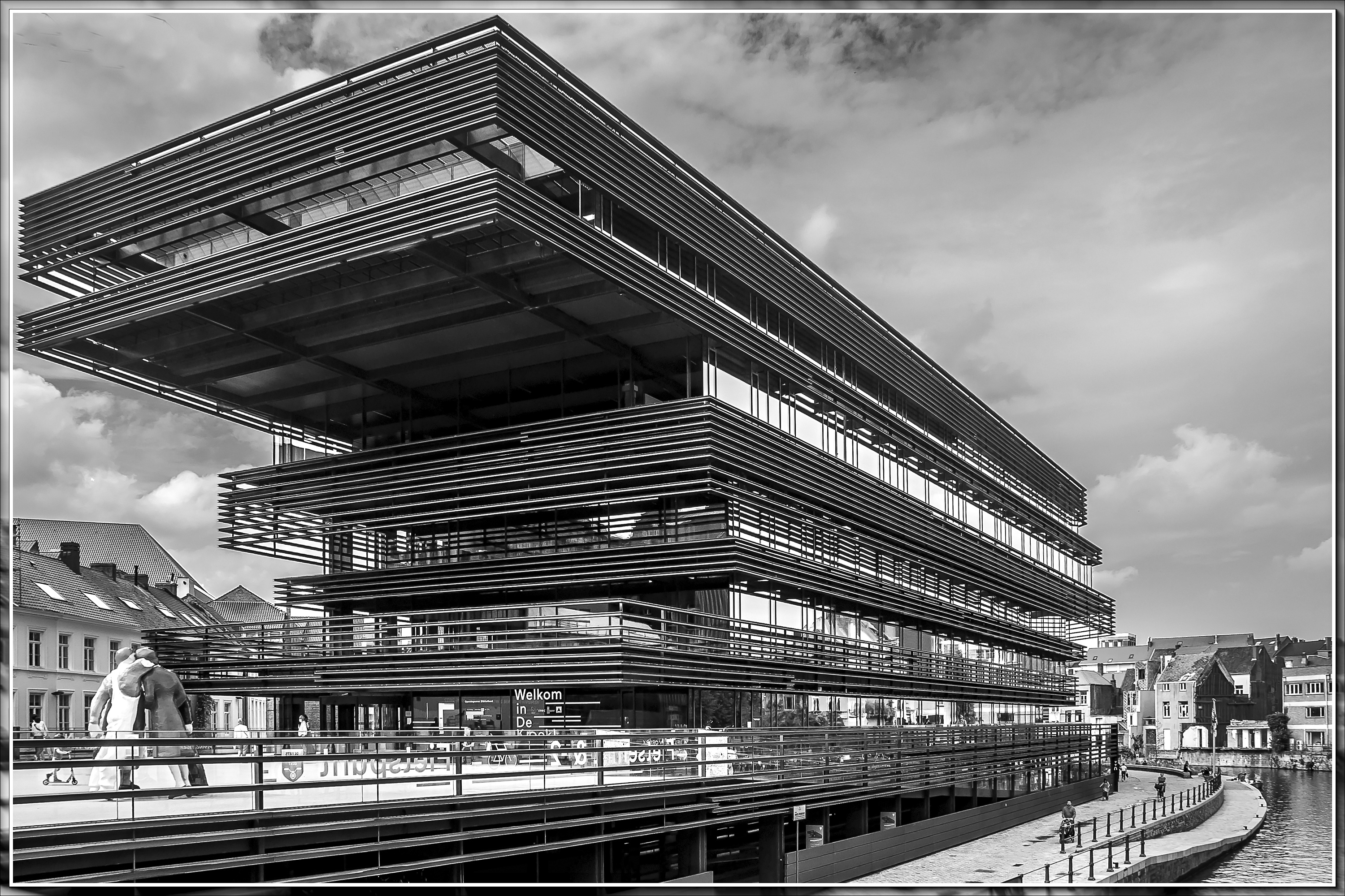 It shows 'De Krook Library', a modern library and media center located in downtown Ghent, Belgium (along the Scheldt river at the former 'Waalse Krook' site). The facility was officially opened to the public in March 2017.