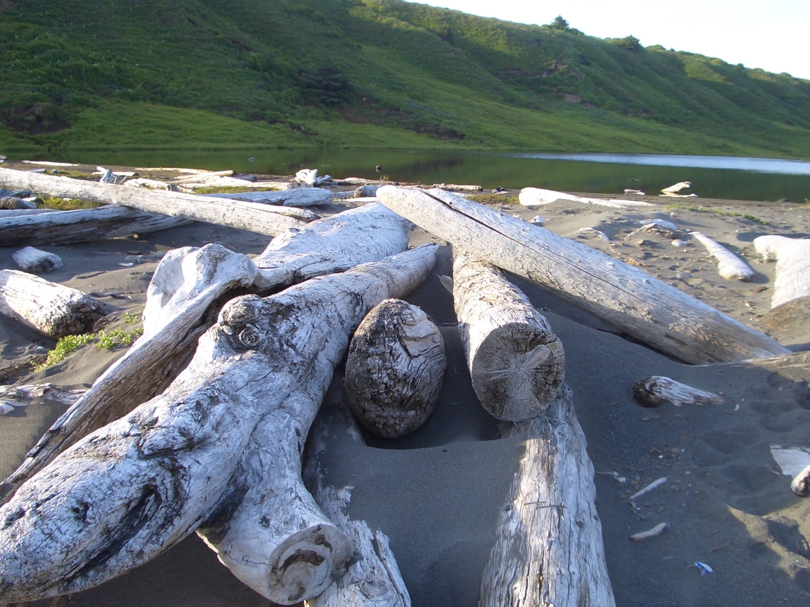 white drift wood on fossil beach on Kodiak Island, Alaska.