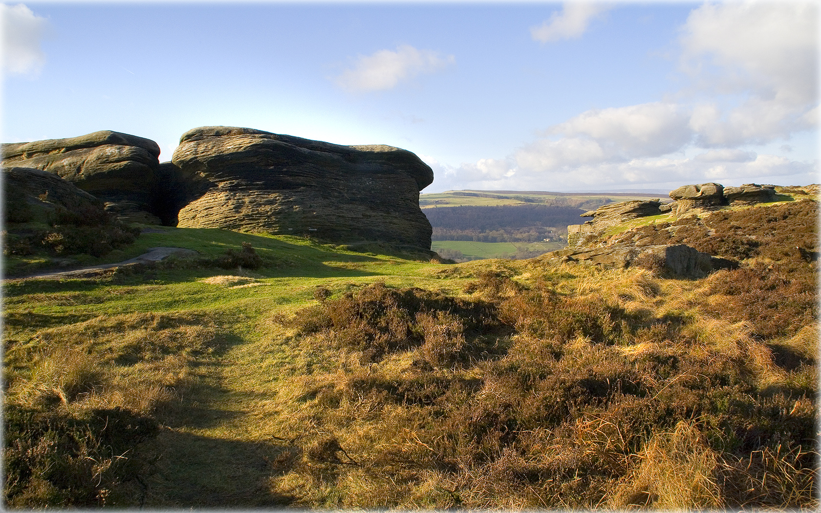 ....nooo not what you think! ...but we might call at the pub later! ;) looking towards the Derbyshire countryside over rocky Curbar Edge!