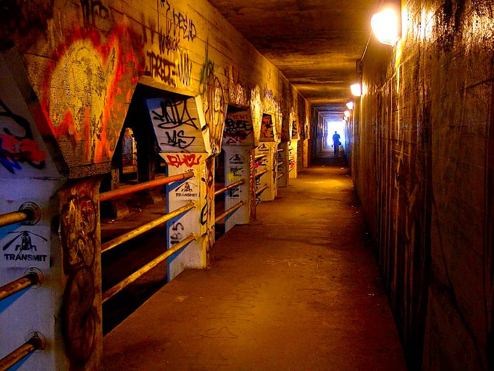 There is a section of Atlanta, GA, known as Cabbagetown that use to be one of the poorest sections of the city, but has recently become gentrified. Cabbagetown is at the end of this tunnel. There have been several music videos shot in this tunnel and this photo of mine has been used by an Atlanta jazz group for its latest CD cover. Cars are usually zipping through the tunnel just on the other side of the railing, so I was delighted to be able to catch this guy in silouette without an auto in the pic.