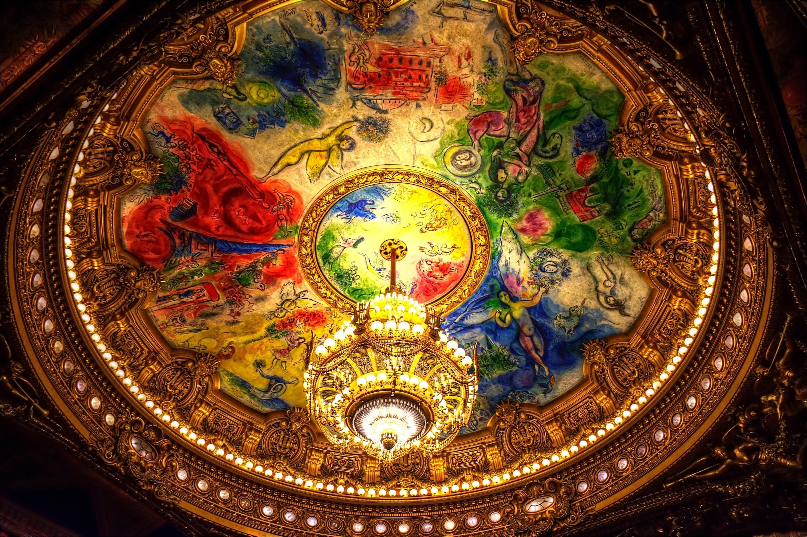 This is the main chandelier in the theater portion of the most famous opera house in the world. It weighs 7 tons and is over 150 years old. It is surrounded by a Painting By (Marc) Chagall so high above the ground. It is in this building that Gaston Leroux's novel Phantom Of The Opera takes place. Paris, France; September, 2015.