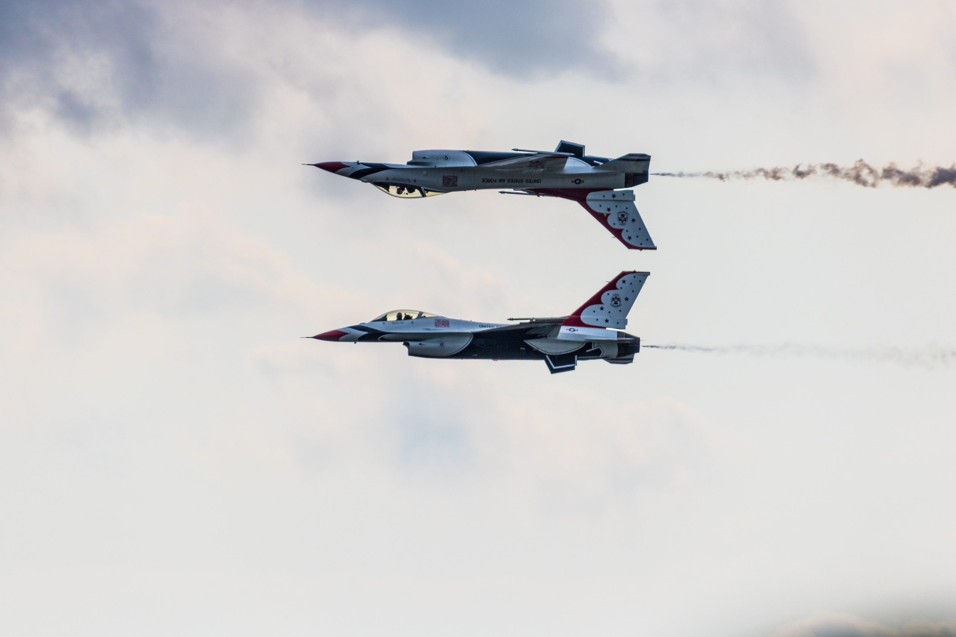 The USAF Thunderbirds #'s 5 and 6 performing a Calypso Pass at Pease Air National Guard Base. Canon EOS Rebel T6i TAMRON 18-400mm F/3.5-6.3 Di II VC HLD B028 f/6.3 227.0 mm 1/2500 ISO 100