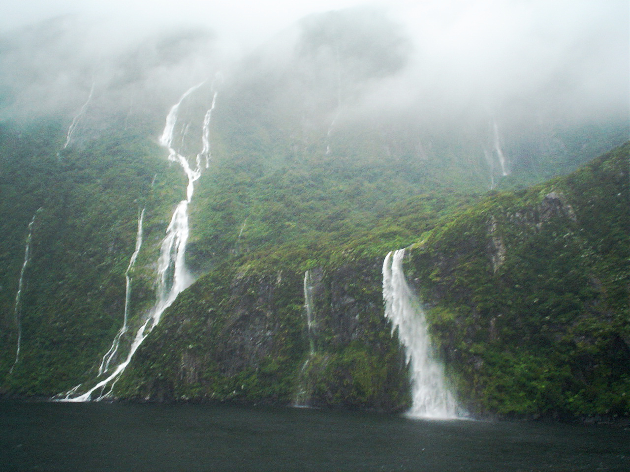 Milford sound is renowed for it's high rainfall. The increase in waterfalls is dependant on how much rain is falling at any one time. This day it had been raining non stop for weeks, and the waterfalls were everywhere. I was on a cruise and as you can see there was heaps of mist and lowlying rainclouds. It was amazing.