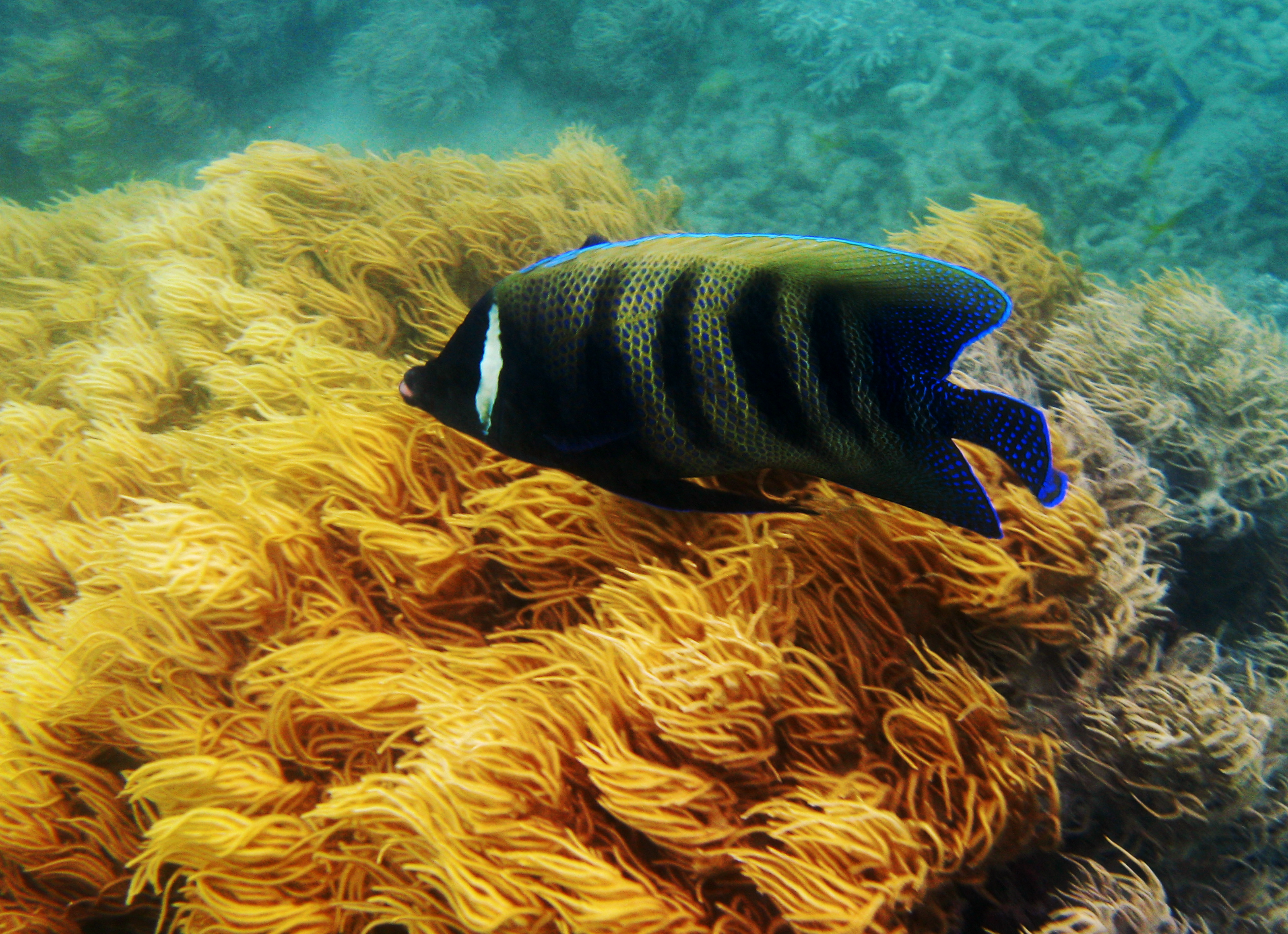 this is just one of many fish who swam into my field of vision underwater. I have another shot of this little beauty.. But no idea what his name is... the coral under him is spagetti coral..