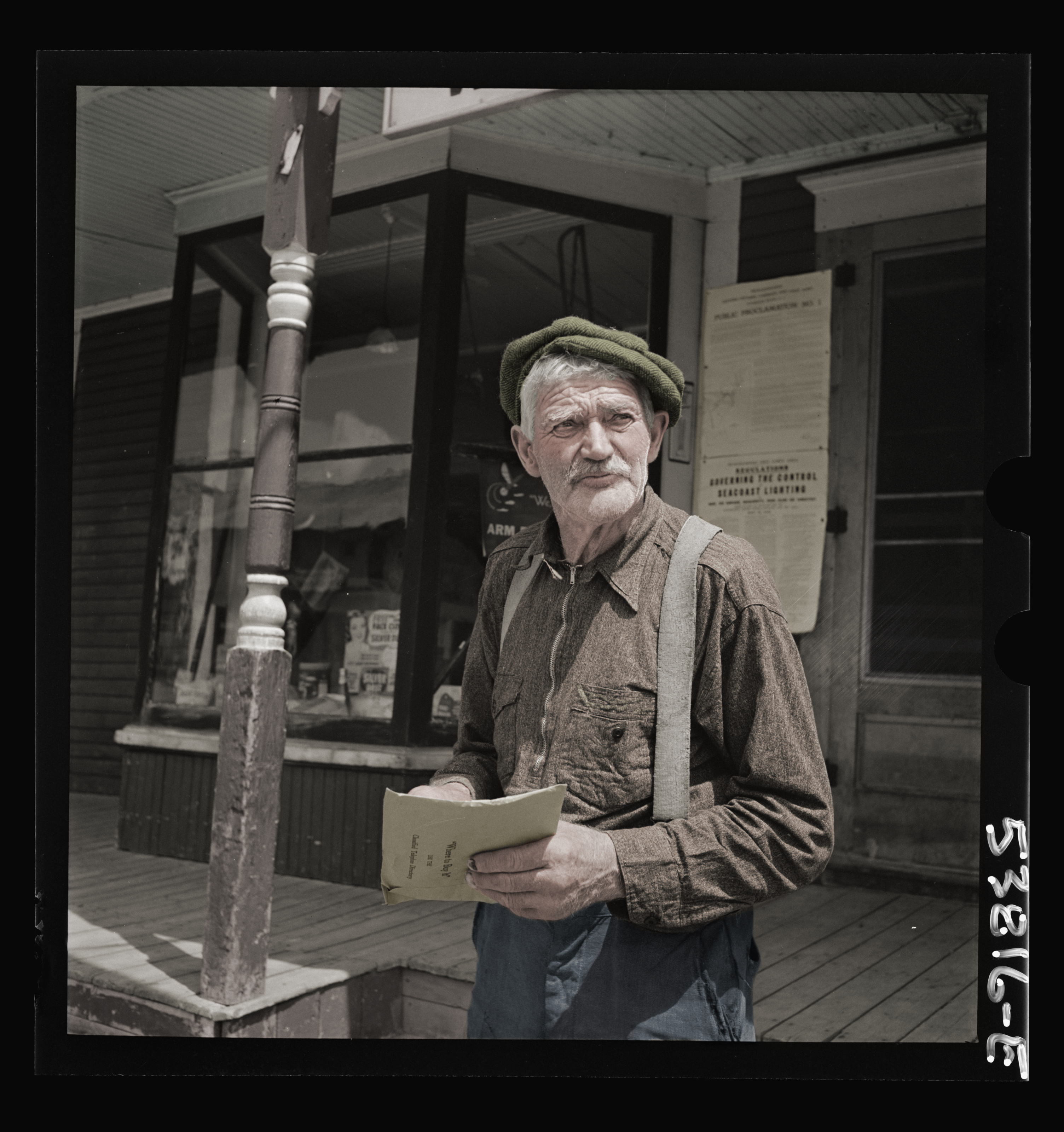 The Library Congress Frank Goss I claim no rights other than colorizing this image if you wish to use let me know and always give due credit to The Library of Congress I have no commercial gain in publishing this image. Title West Danville, Vermont. Frank Goss, seventy-one year old farmer, in front of Gilbert S. Hastings General Store and post office reading his mail which includes a card saying that his last year's hired man "wont be aroun for hayin' this year on account of he's in Californi' in the Navy" Contributor Names Henle, Fritz, 1909-1993, photographer Created / Published 1942 July. Subject Headings - United States--Vermont--Caledonia County--West Danville Format Headings Nitrate negatives. Genre Nitrate negatives Notes - Annotation on original negative jacket. - Title and other information from caption card. - Transfer; United States. Office of War Information. Overseas Picture Division. Washington Division; 1944. - More information about the FSA/OWI Collection is available at http://hdl.loc.gov/loc.pnp/pp.fsaowi - Temp. note: owibatch6 - Film copy on SIS roll 17, frame 271. Medium 1 negative : nitrate ; 2 1/4 x 2 1/4 inches or smaller. Call Number/Physical Location LC-USW3- 053816-E [P&P] LOT 1818 (Location of corresponding print.) (corresponding photographic print) Source Collection Farm Security Administration - Office of War Information photograph collection (Library of Congress) Repository Library of Congress Prints and Photographs Division Washington, D.C. 20540 USA http://hdl.loc.gov/loc.pnp/pp.print Digital Id fsa 8d36047 //hdl.loc.gov/loc.pnp/fsa.8d36047 Library of Congress Control Number 2017866511 Reproduction Number LC-DIG-fsa-8d36047 (digital file from original neg.) LC-USW3-053816-E (b&w film nitrate neg.) Rights Advisory No known restrictions. For information, see U.S. Farm Security Administration/Office of War Information Black & White Photographs http://www.loc.gov/rr/print/res/071_fsab.html Online Format image Description 1 negative : nitrate ; 2 1/4 x 2 1/4 inches or smaller.