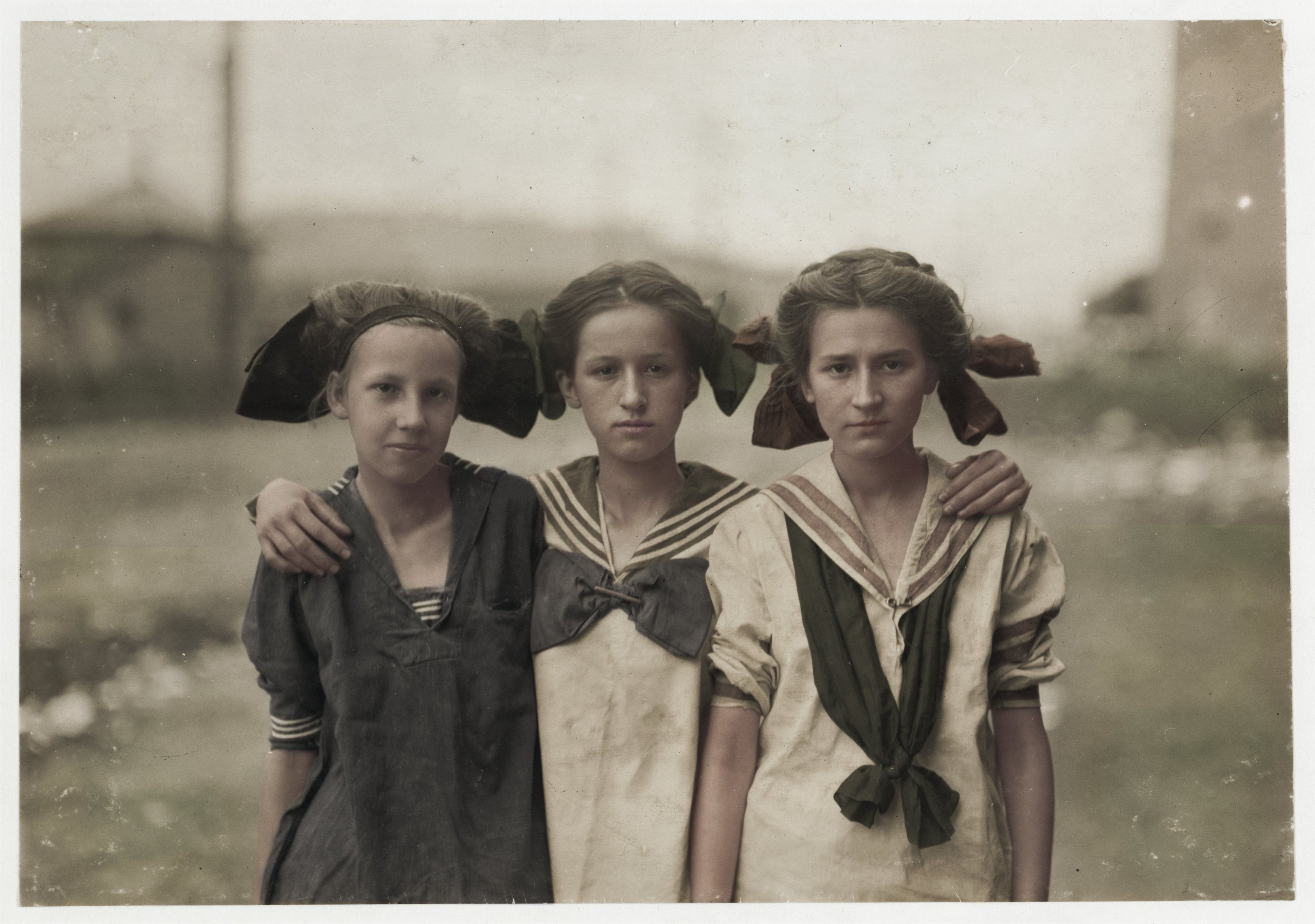 Library of Congress I claim no rights other than colorizing this image if you wish to use let me know and always give due credit to The Library of Congress I have no commercial gain in publishing this image. Title Adolescent spinners in the Suffolk (Va.) Knitting Mills. One of these, fourteen years old, said she had been working here, off and on, for four years, and earns about one dollar a day now. Location: Suffolk, Virginia. Contributor Names Hine, Lewis Wickes, 1874-1940, photographer Created / Published 1911 June. Subject Headings - Girls - Textile mill workers - United States--Virginia--Suffolk Format Headings Photographic prints. Rights Advisory No known restrictions on publication.