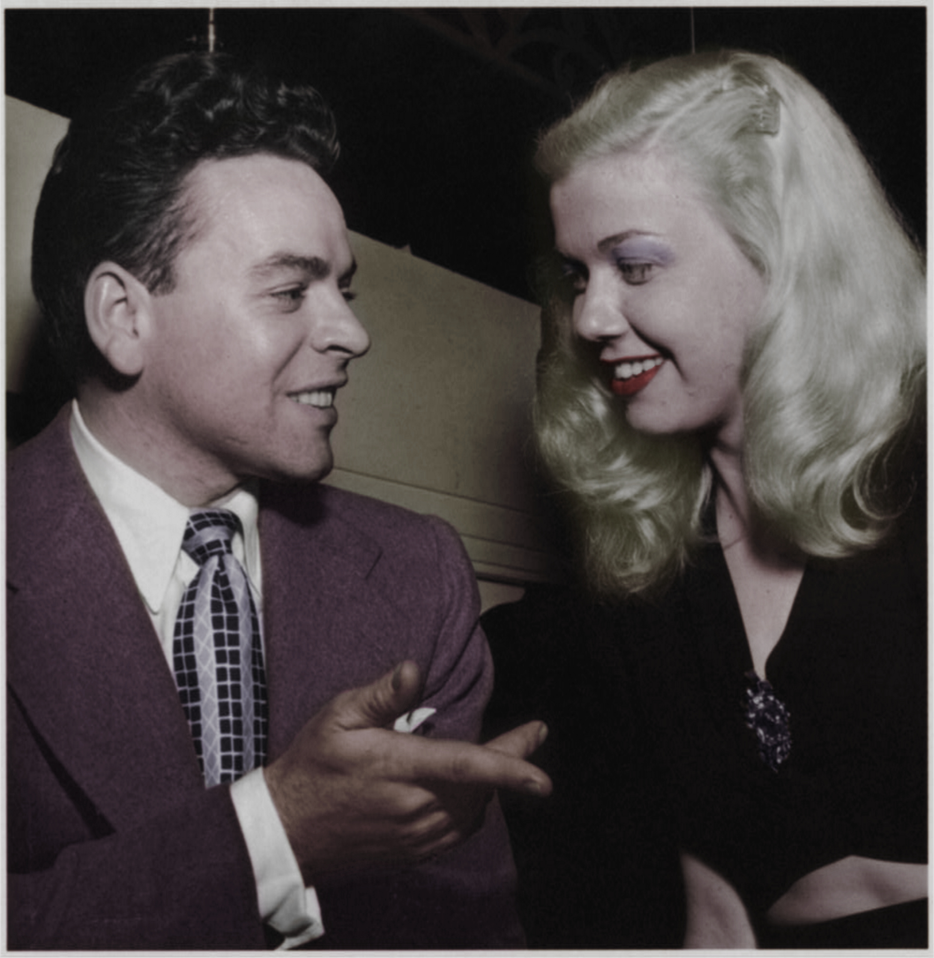 The Library of Congress Doris Day and Les Brown1946 I claim no rights other than colorizing this image if you wish to use let me know and always give due credit to The Library of Congress I have no commercial gain in publishing this image. Title [Portrait of Doris Day and Les Brown, Aquarium, New York, N.Y., ca. July 1946] Other Title Caption from Down Beat: Les Brown and Doris Day Alternate Title Caption from Down Beat: Les Brown and Doris Day Contributor Names Gottlieb, William P. -- 1917- (photographer) Created / Published 1946, monographic. Subject Headings - Day, Doris, 1924- - Brown, Les, 1912- - Jazz musicians -- 1940-1950 - Women jazz musicians -- 1940-1950 - Jazz singers -- 1940-1950 - Actresses -- 1940-1950 - Composers -- 1940-1950 - Aquarium Mr. Gottlieb has dedicated these works to the public domain, but rights of privacy and publicity may apply.