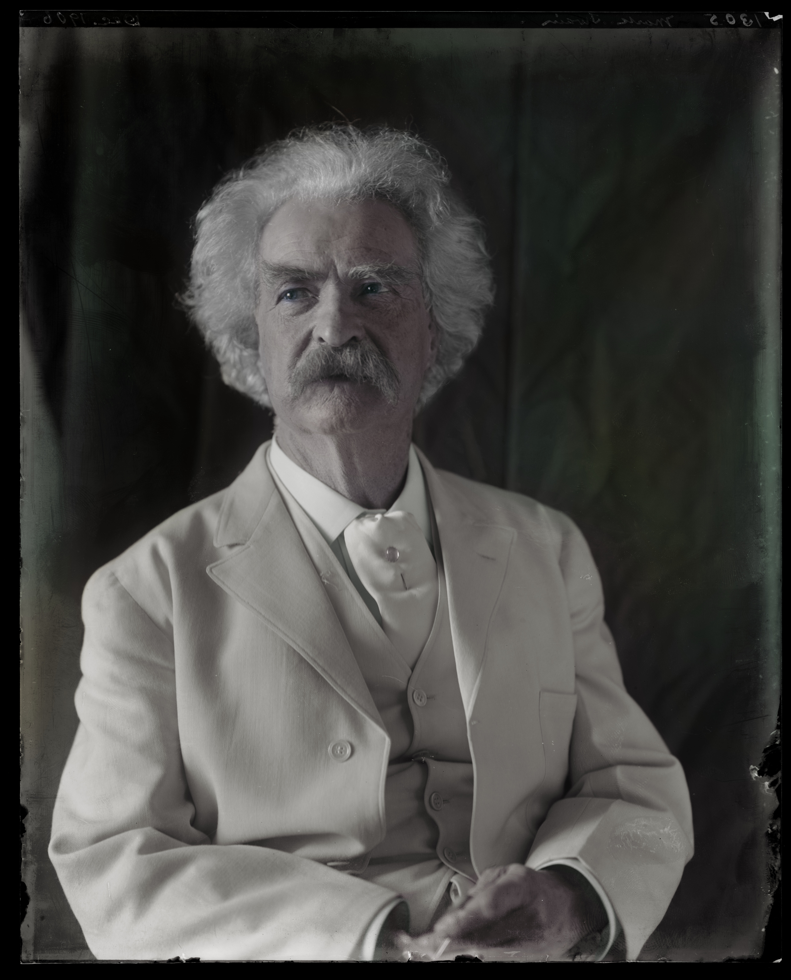 The Library of Congress Mark Twain 1906 I claim no rights other than colorizing this image if you wish to use let me know and always give due credit to The Library of Congress I have no commercial gain in publishing this image. Title [Samuel Clemens, also known as Mark Twain] Summary Photograph shows portrait of Clemens in light suit. Contributor Names Johnston, Frances Benjamin, 1864-1952, photographer Created / Published [1906] Subject Headings - Twain, Mark,--1835-1910 Headings Glass negatives--1900-1910. Portrait photographs--1900-1910. Rights Advisory No known restrictions on publication.