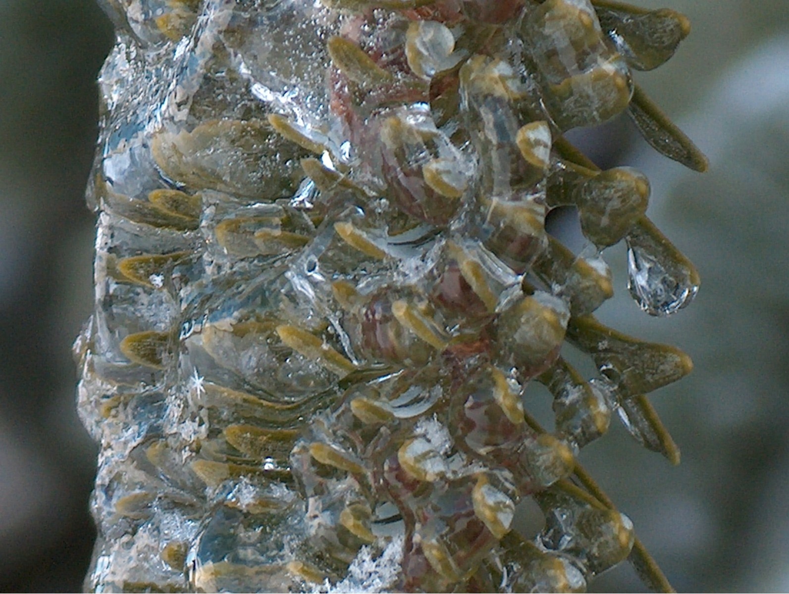 This is the tip of a pine branch weighed down with ice from an ice storm that took out the power for over 200,000 people for 5 days. This ice has still not melted. This was taken in my ice covered 2 acres of tree's.