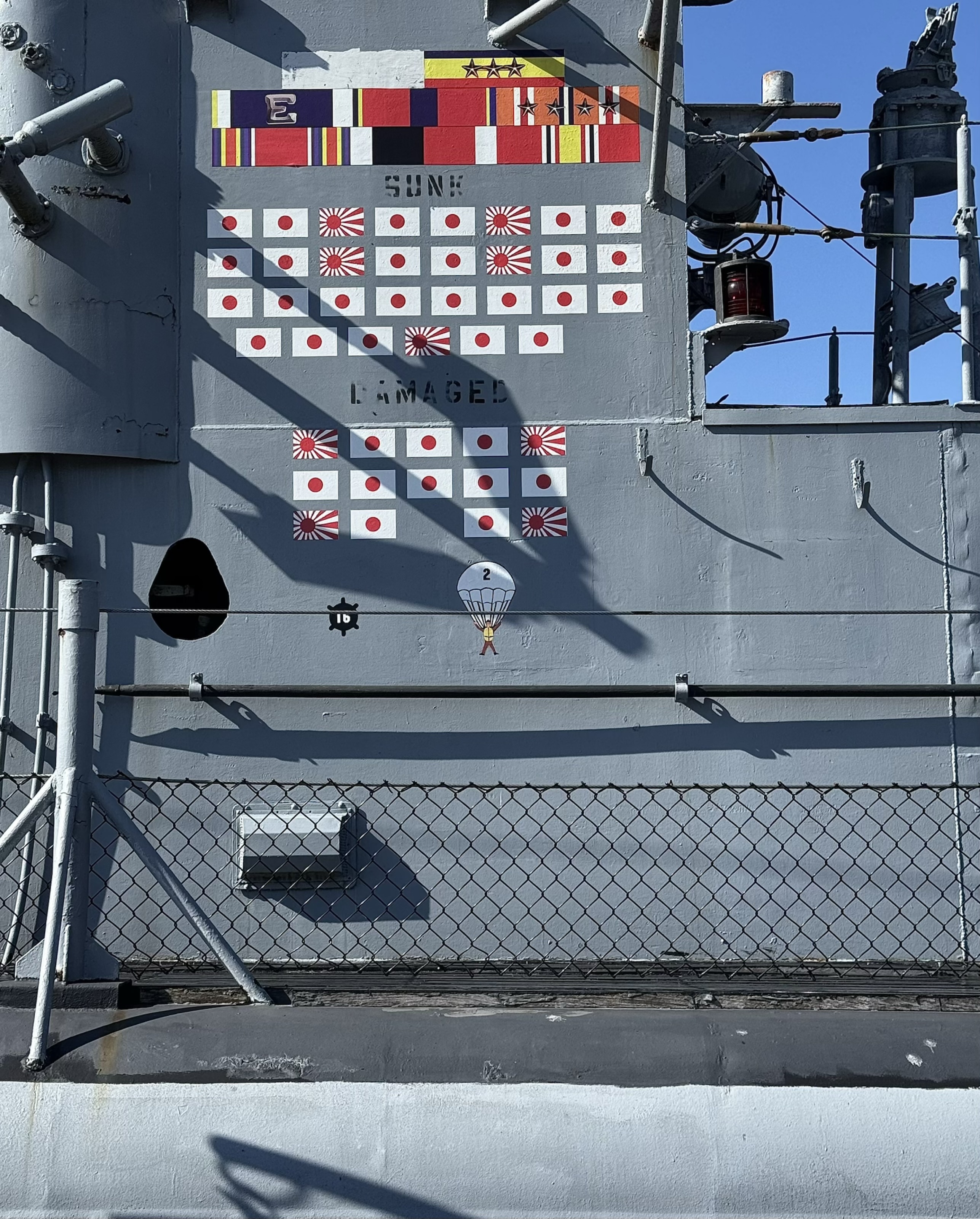 The markers you see represent the conflicts they were a part of. The parachute represents 2 pilots they saved. She was one of most successful ships.Mr. C stated that she was awarded a presidential citation. Thanks for your comments. tigs=^..^=