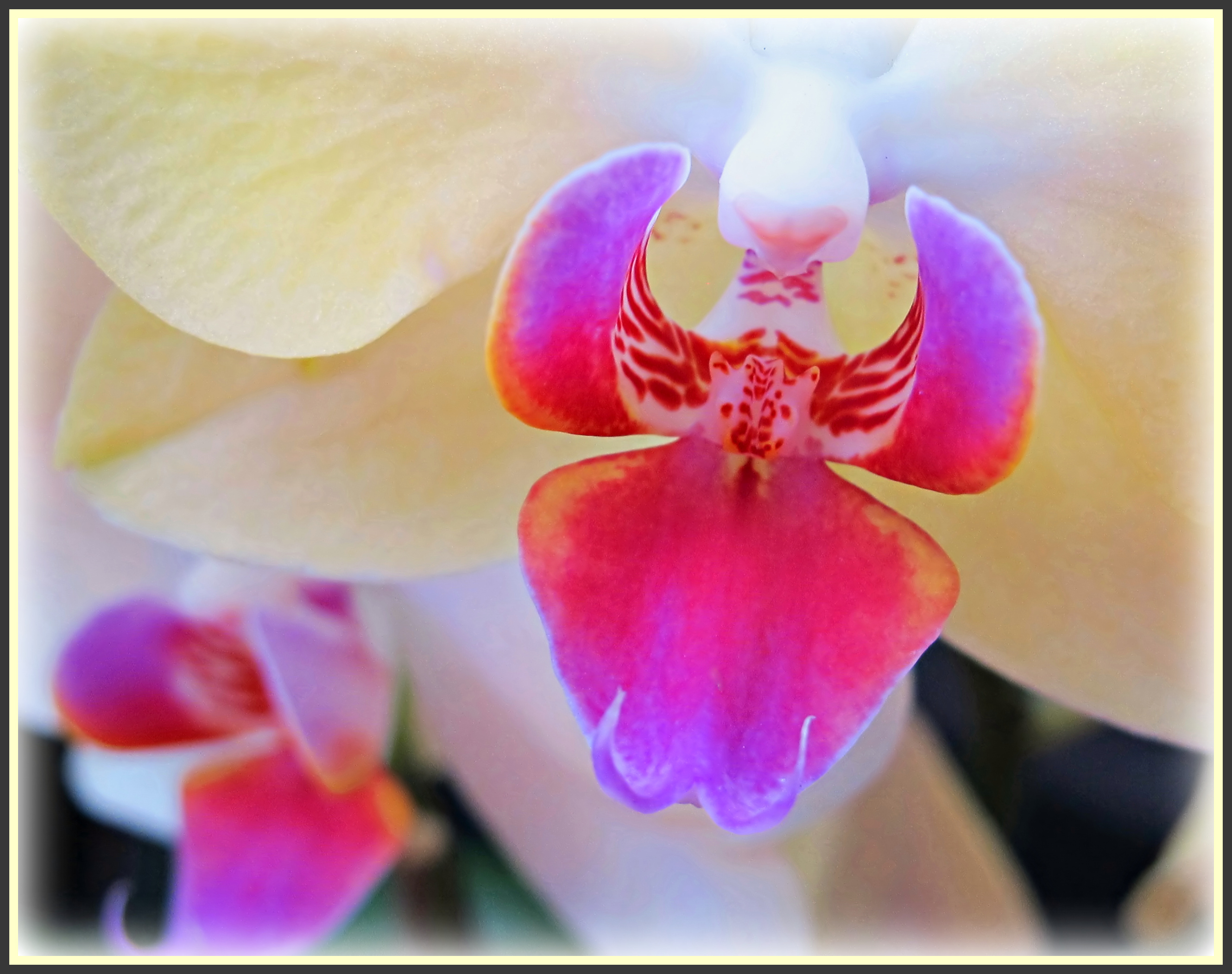 This is the interior of an orchid I posted called "Lemon Mousse". I love the vibrancy of color of the inner orchid against that very soft creamy yellow. All comments and critiques appreciated.