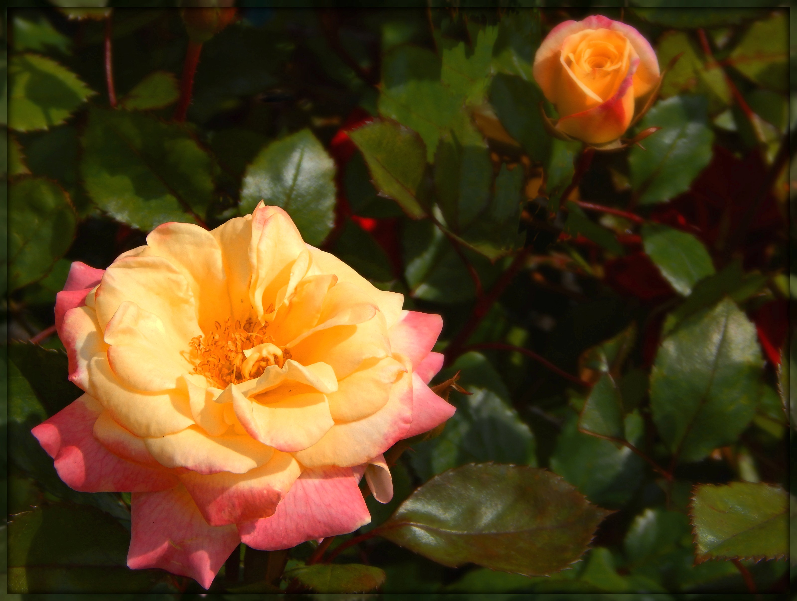 I liked the rose's position in the frame and I always like to get a bud and an open bloom. This is late afternoon light which I found is very complementary to roses for some reason.