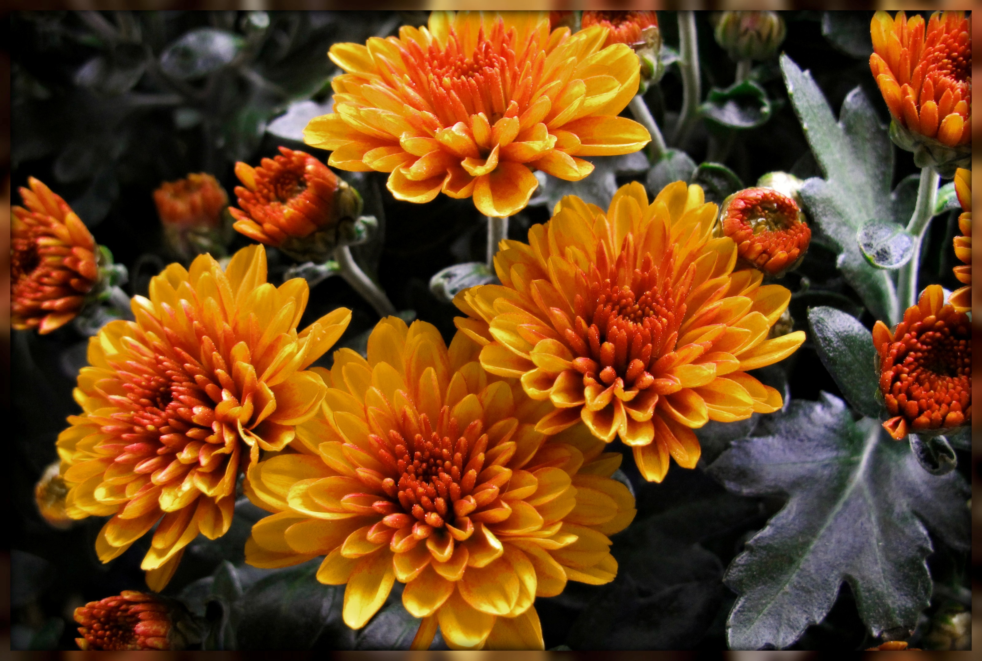 These are a pretty bronze color mum - the buds are orange but they turn a golden bronze color as they open. I have two major mum growers very near me so I get access to lots of mum shots if I choose.