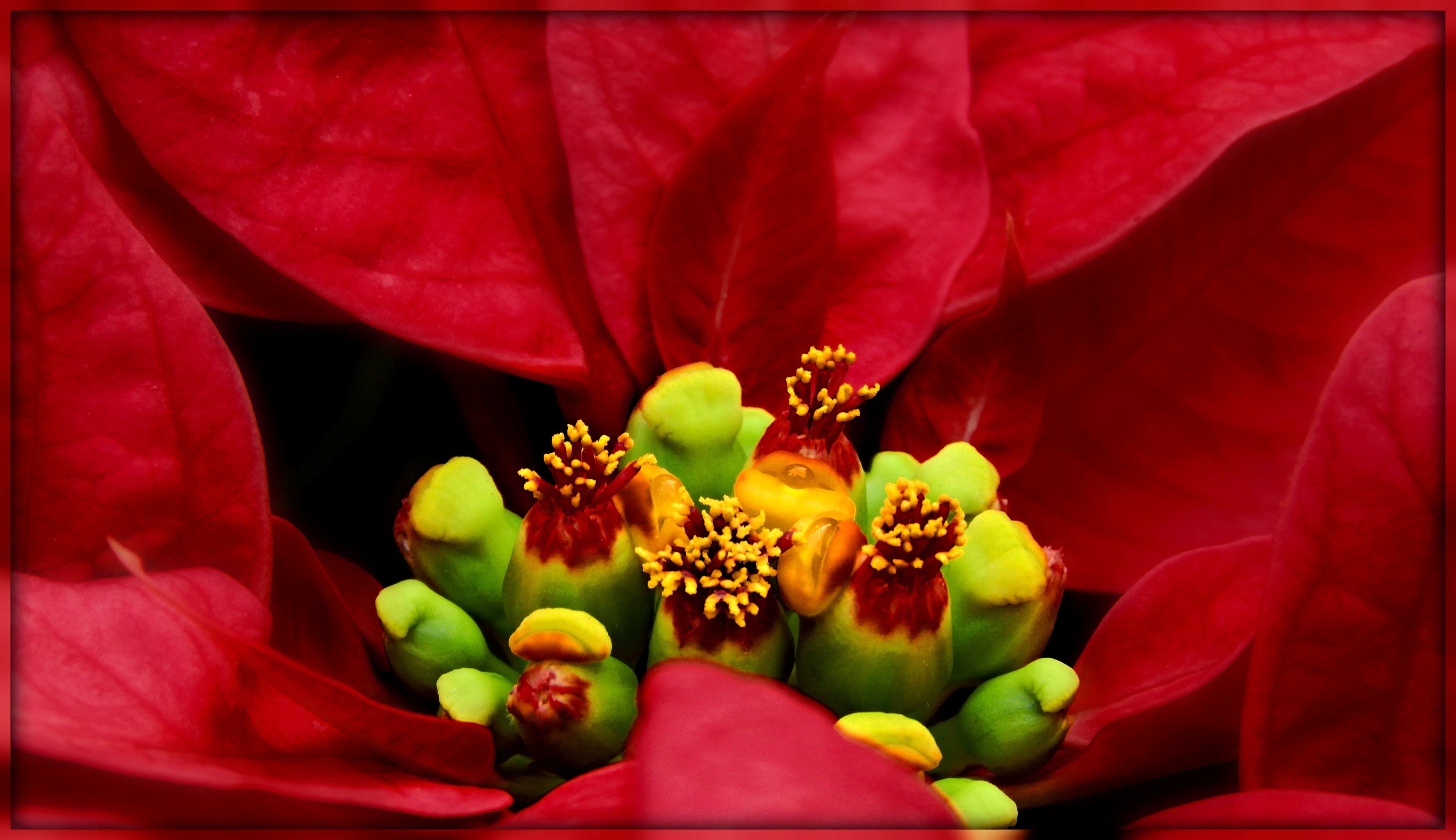The center flowers of a very deep red poinsettia. An early Fx2 post - I might just post another tomorrow too!