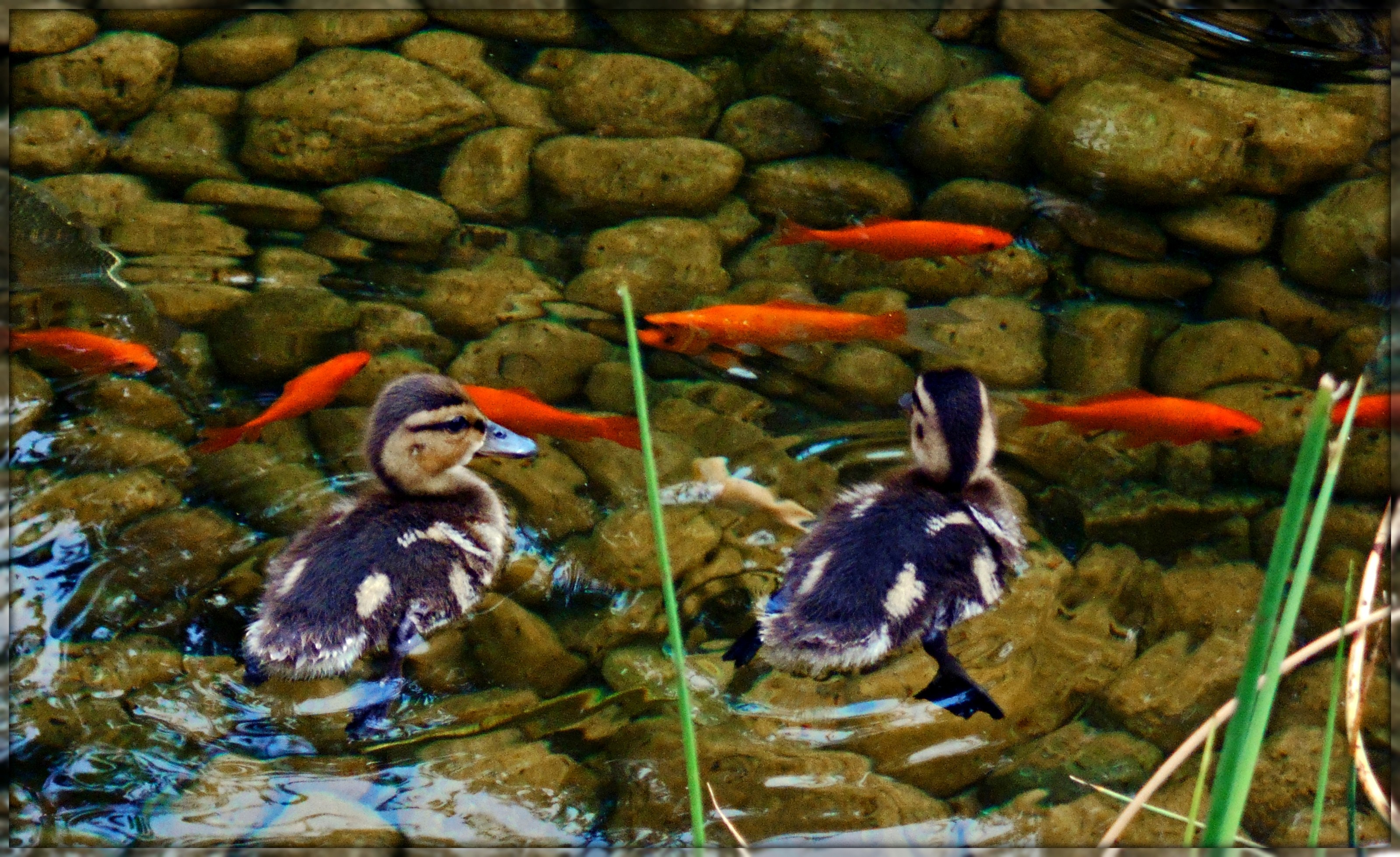 Another one for Wacky Wednesday - a couple of mallard ducklings contemplating life in the koi pond!