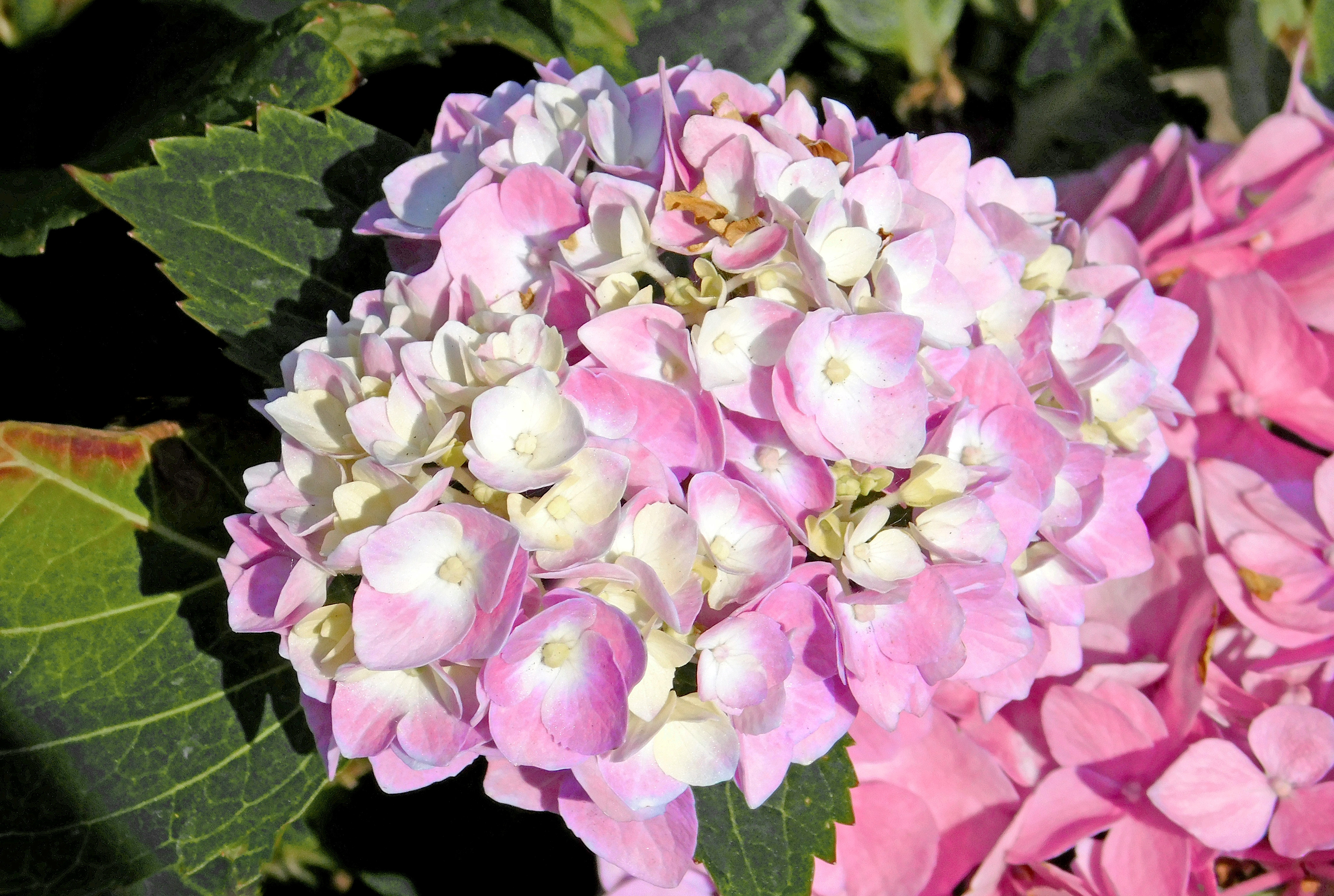 This is one of the hydrangeas on the property where I live. The large white snowballs are now green but the purple and pink ones are still putting out new blooms as you can see in this new one. My foofy for Friday.